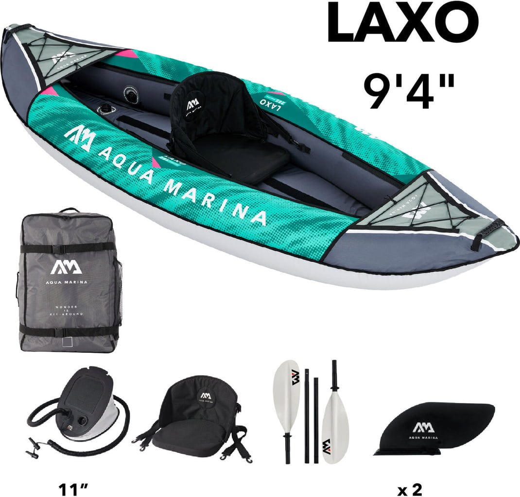 Каяк Laxo – Зелен/Сив за 1 човек с транспортна раница, крачна помпа, 1x седалка, 2x перка, 1x KP-1 гребло (4-части)