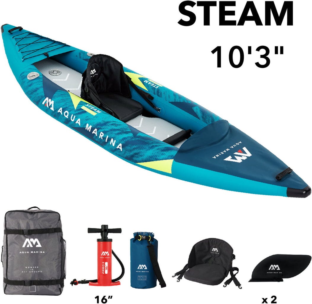 Каяк Steam – Син за 1 човек с раница, ръчна помпа, 1x седалка, 10 литров водоустойчив сак, 2x плавници