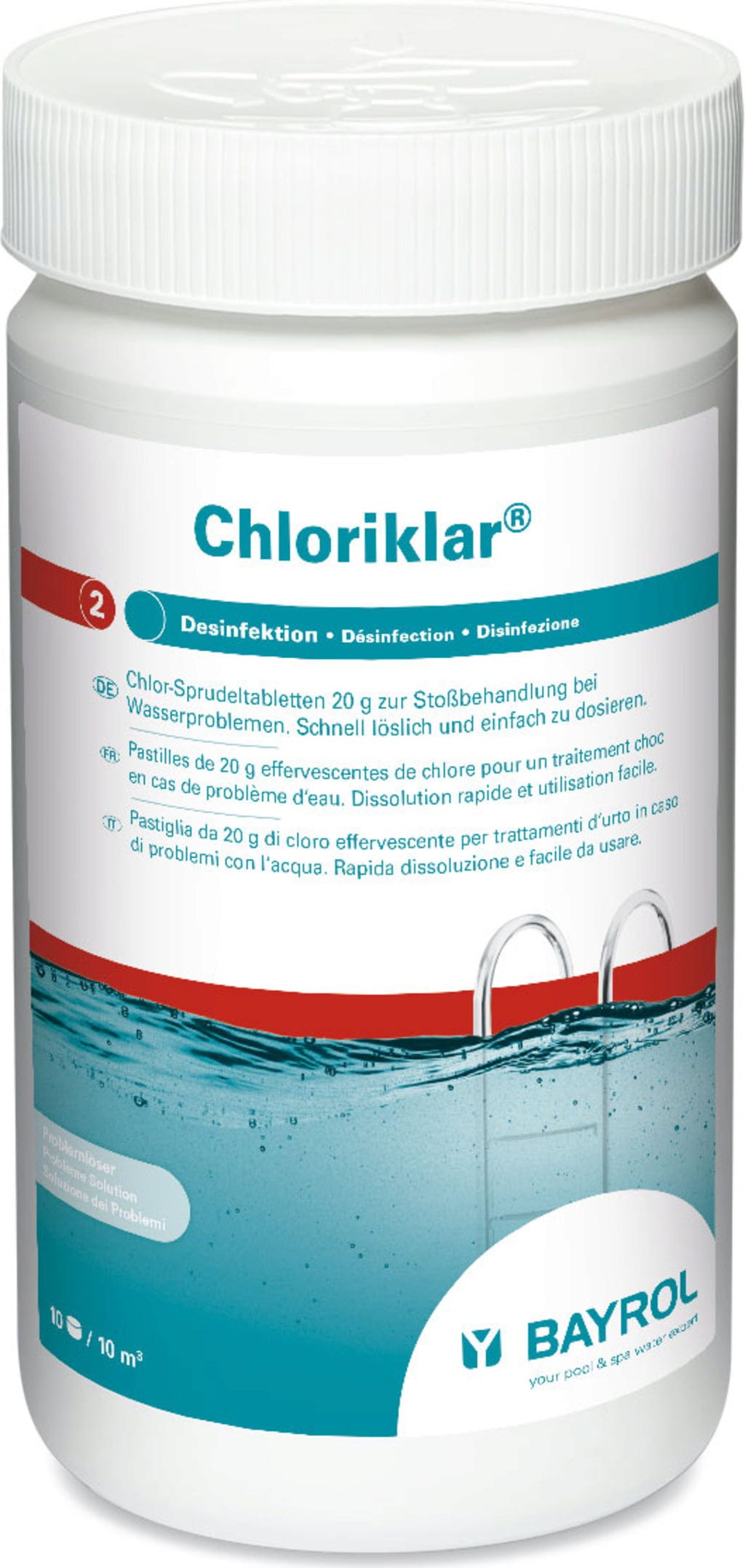 Проблеми с водата в басейна? По-добре вземете Хлориклар®! Бързодействащите 20 г хлорни таблетки за разтваряне са лесни за дозиране и надеждно борят бактерии, гъбички, вируси и органични замърсявания. Скоро водата в басейна ви ще бъде отново кристално чиста!
