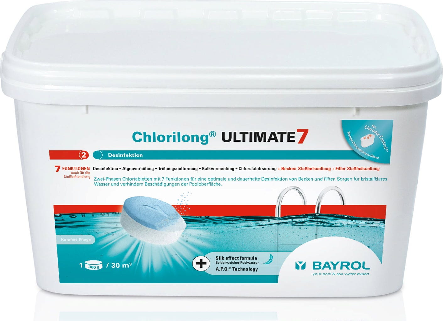 Използвайте Chlorilong® ULTIMATE7 за дезинфекция на водата и филтъра, за да можете спокойно да се отпуснете в басейна. Таблетките за хлор от 300 г в две фази имат 7 полезни функции: