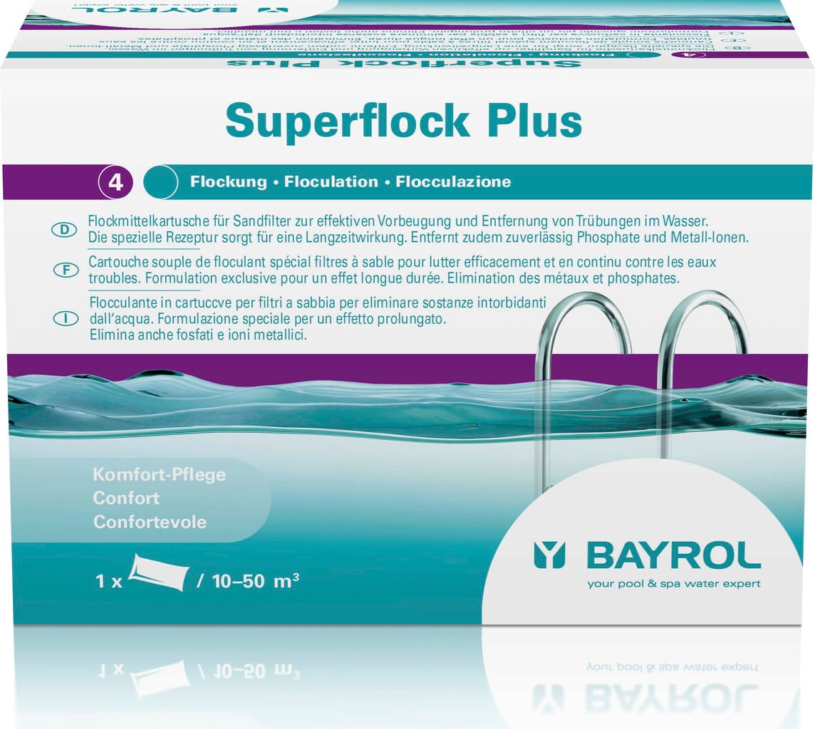 Бързо обратно към кристално чиста басейнова вода с Superflock Plus. Предварително дозираните флокулантни патрони дългосрочно подобряват производителността на пясъчното филтриращо устройство. Това позволява лесно отстраняване на нежелани метални йони и фосфати от водата.