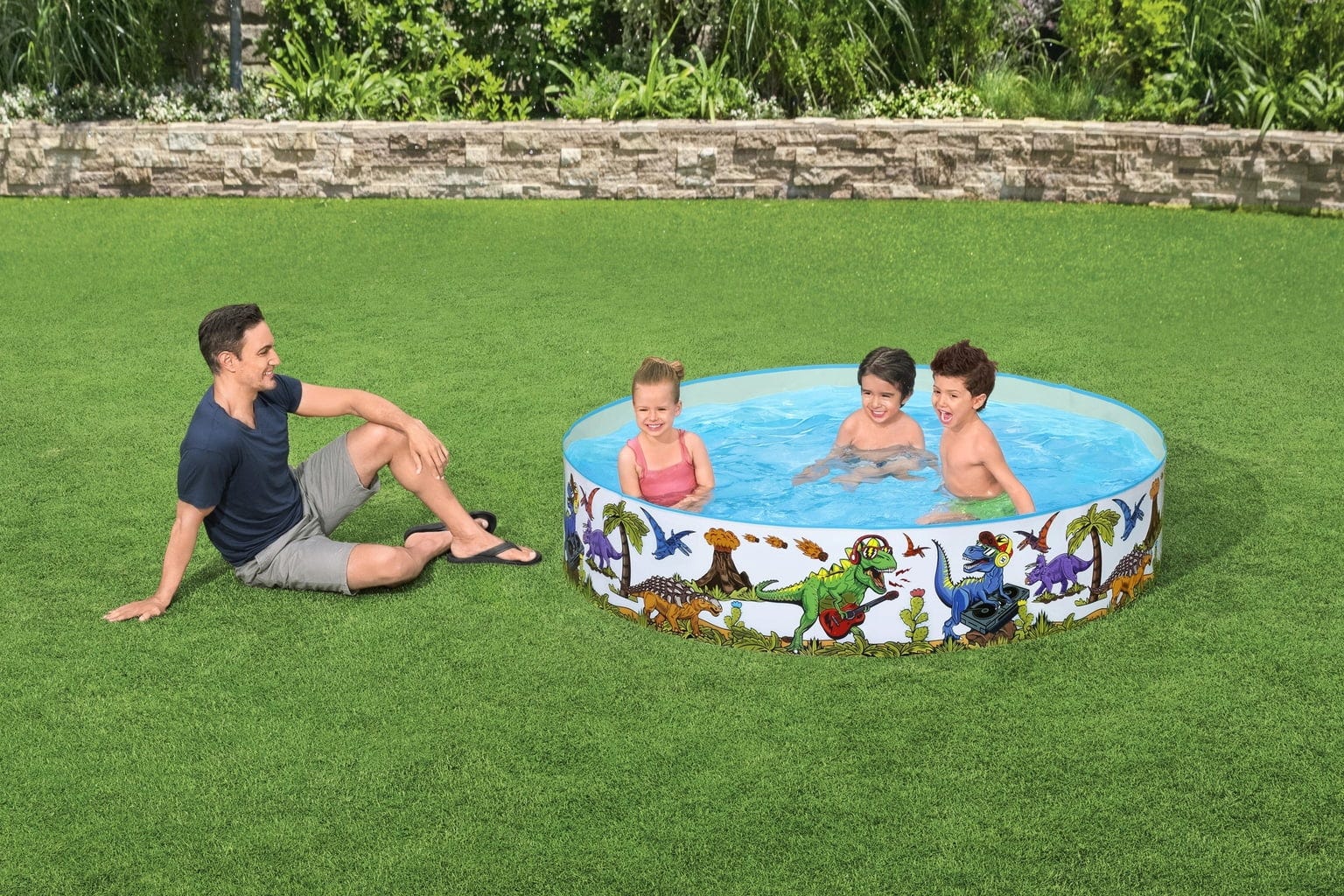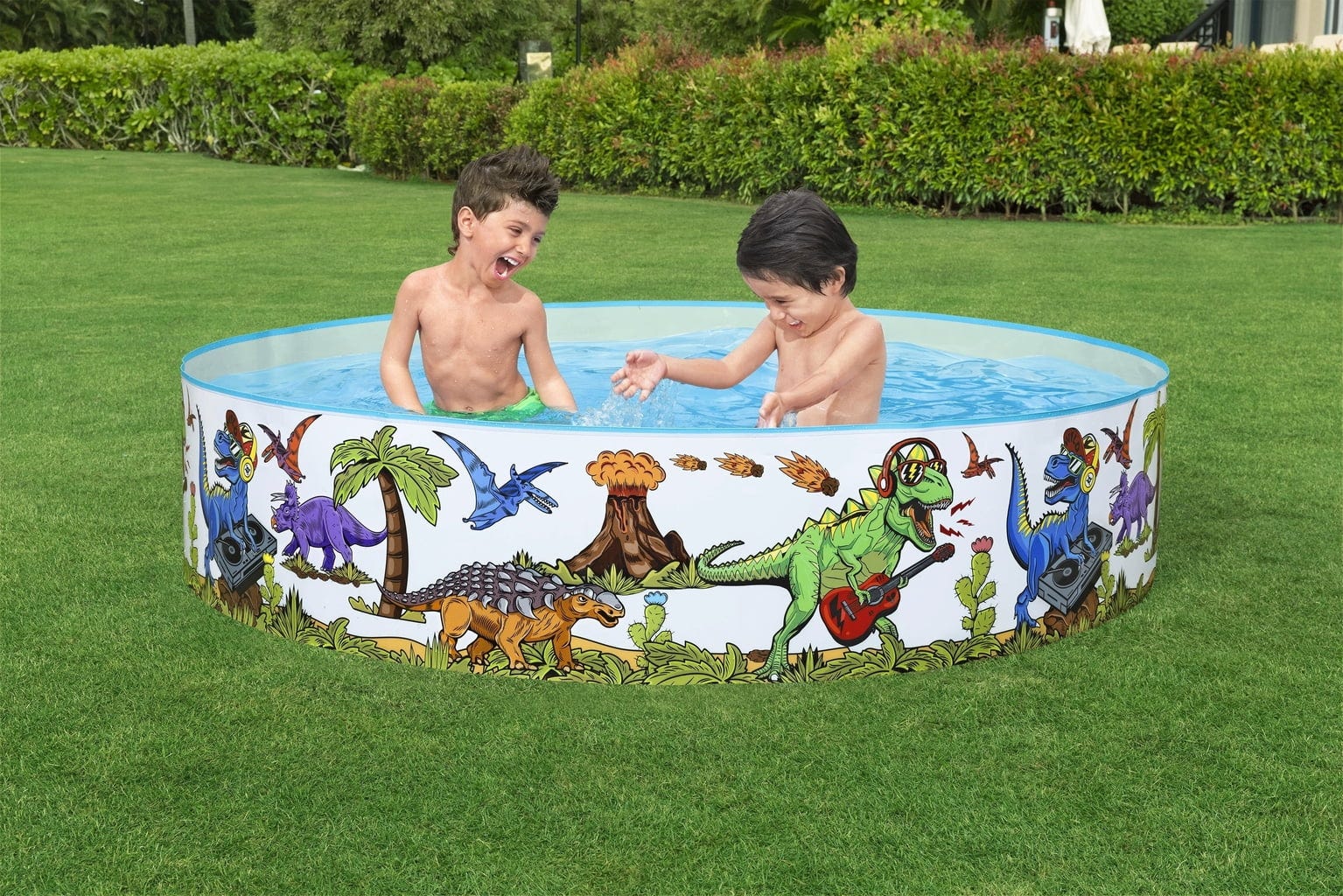 С Bestway Fill 'N Fun™ детски басейн пренесете динозавърското приключение директно във вашата градина! Най-хубавото е, че басейнът не изисква помпане и е готов за употреба веднага! Стабилните странични стени и здраво прикрепеното дъно са изработени от здрав PVC, което позволява часове на водни забавления.