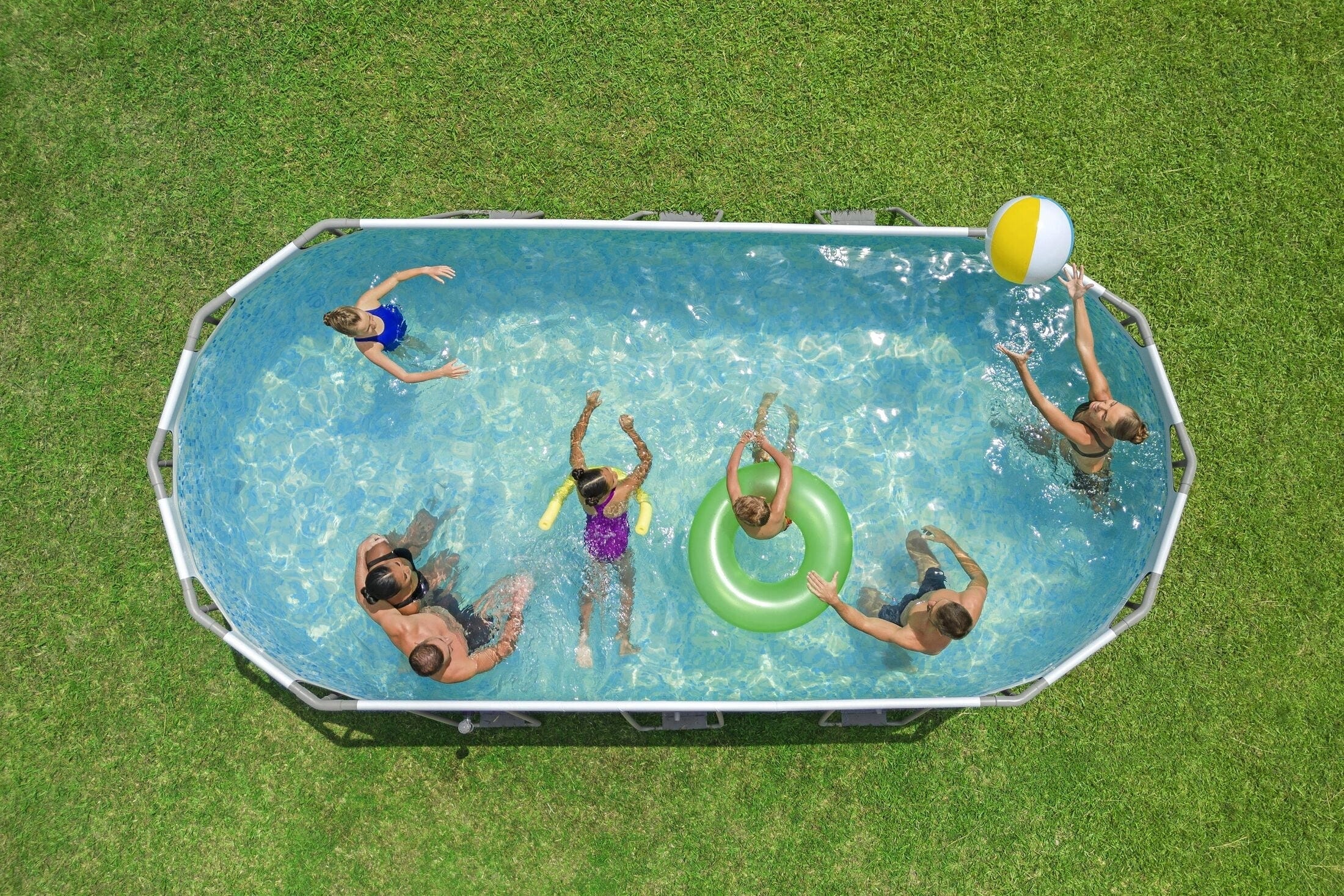 С Bestway Power Steel™ Frame Pool получавате дълготрайно качество и максимално удоволствие от къпането у дома! Благодарение на овалната си форма, той не само предлага много пространство за релакс, но и заема значително по-компактна площ в сравнение с кръглите басейни. Стилната сива външна стена и класическата мозайка вътре създават истинско празнично настроение.