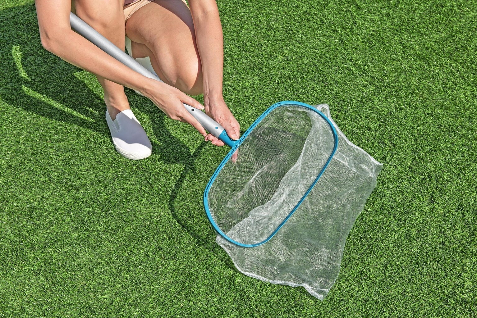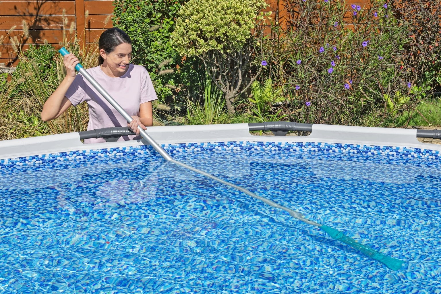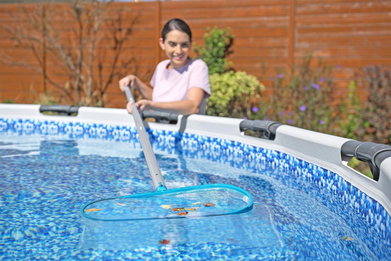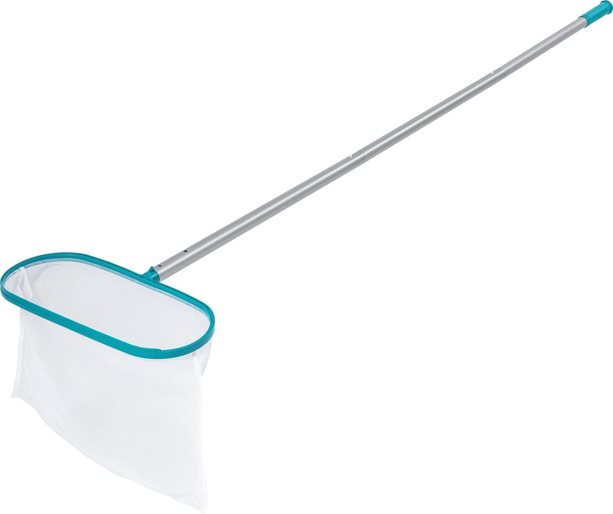 Здравото кепче премахва листа и големи частици от повърхността на водата, докато със закръглената четка за басейни ще се справите с упоритите замърсявания по стените и дъното, без да нараните материала на басейна – за най-чисти резултати!
