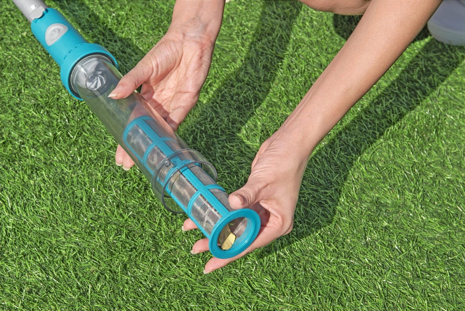 Сърцето на комплекта е прахосмукачката за басейни с батерия. С времетраене на батерията до 50 минути, можете да почистите обстойно басейна, като прозрачният контейнер за събиране на отпадъци ви показва колко замърсявания са вече отстранени. Благодарение на двата различни всмукателни накрайника премахвате както груби замърсявания, така и фин прах лесно.