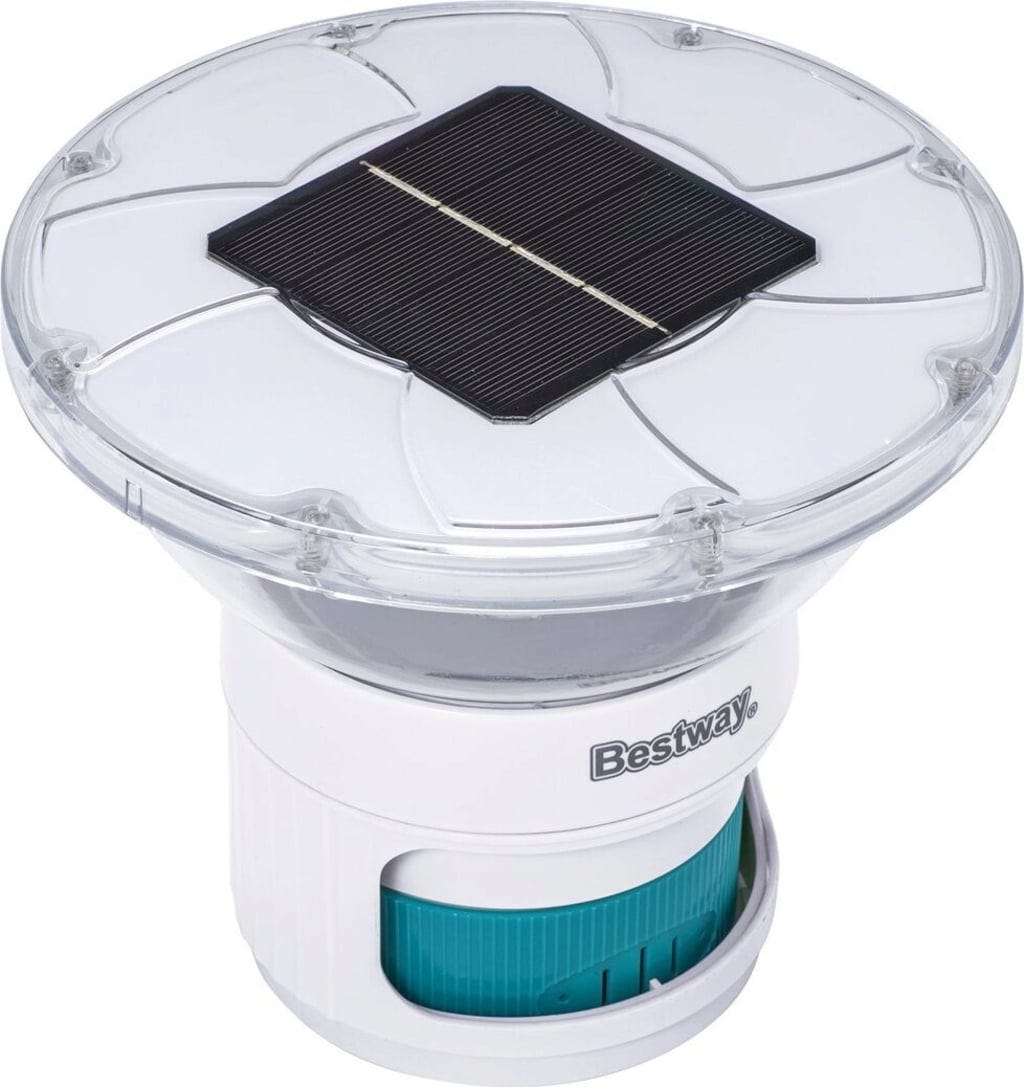 С SolarGlow™ дозатор за басейн на Bestway получавате перфектната комбинация от интелигентен воден грижа и атмосферно светлинно оформление! Устройството е идеално не само като практичен дозатор за бром и хлор таблетки, но също и за създаване на красиви светлинни ефекти! Интегрираният соларен акумулатор използва слънчевата енергия и веднага щом се стъмни, светлинният сензор автоматично включва цветните LED, които озаряват вашия басейн до осем часа в магическа светлина.