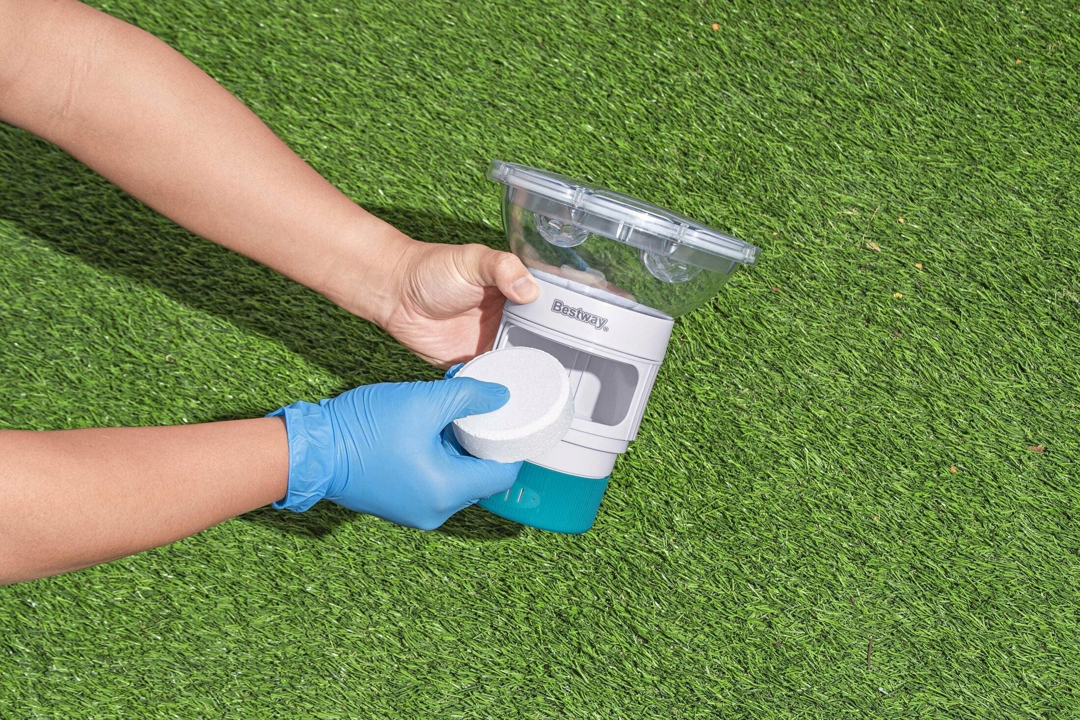Дозаторът за басейн предлага място за до три бромови или хлорни таблетки (Ø 7,6 см).