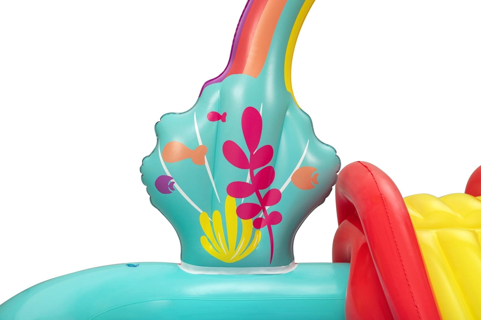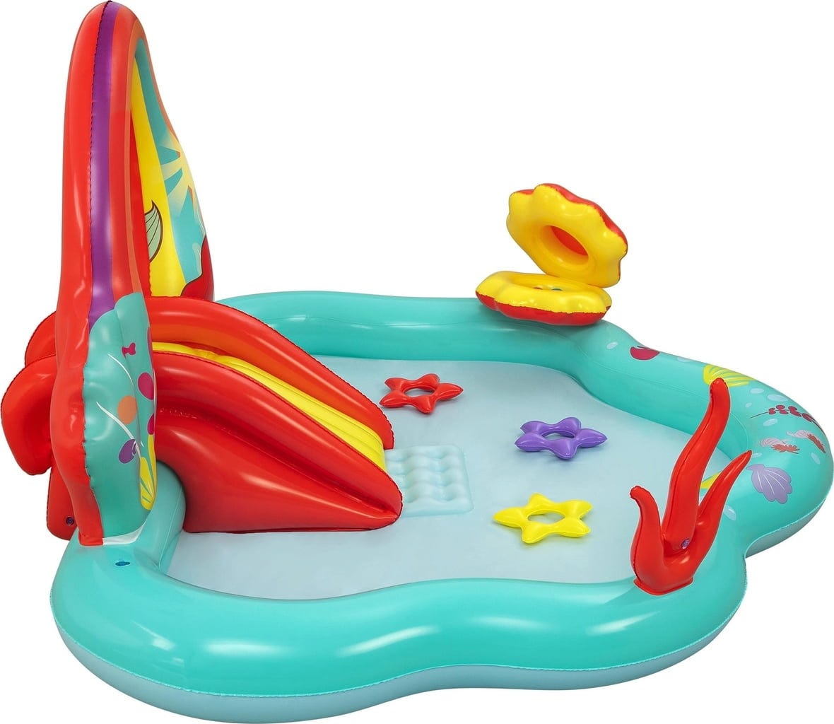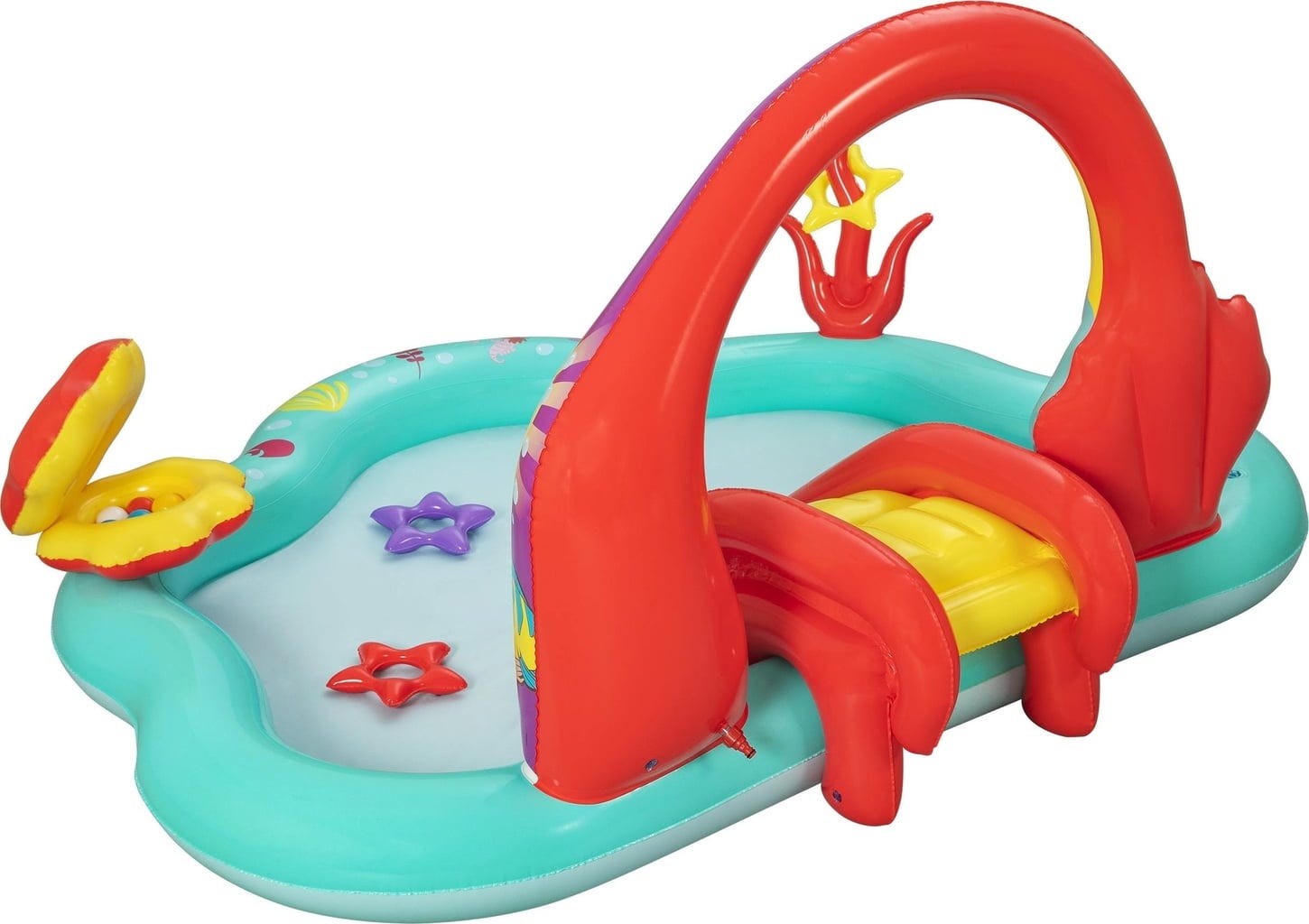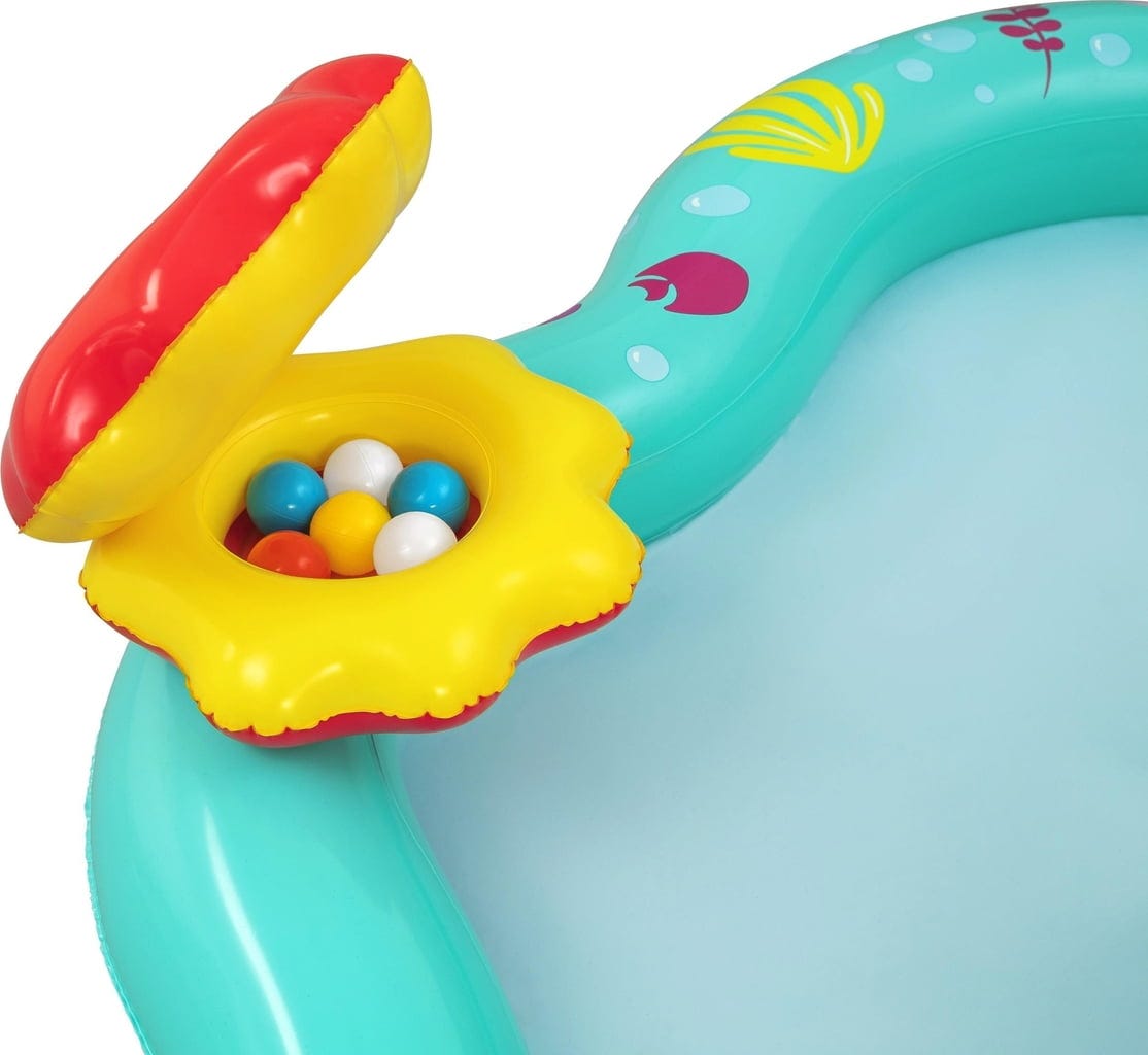 Какво ще кажете за игра с хвърляне на рингове върху корали или игра с топки на мида? Шест цветни топки и три звездовидни ринга чакат да бъдат използвани. Когато децата приключат с игрането, водата може лесно да се източи, благодарение на практичния дренажен вентил.