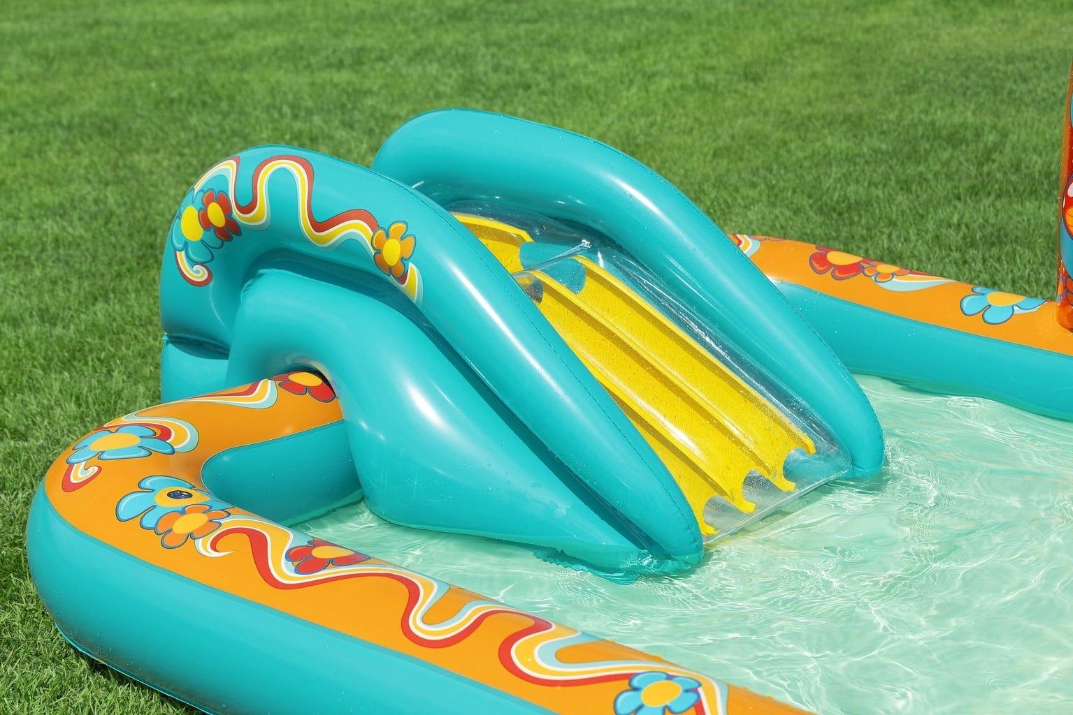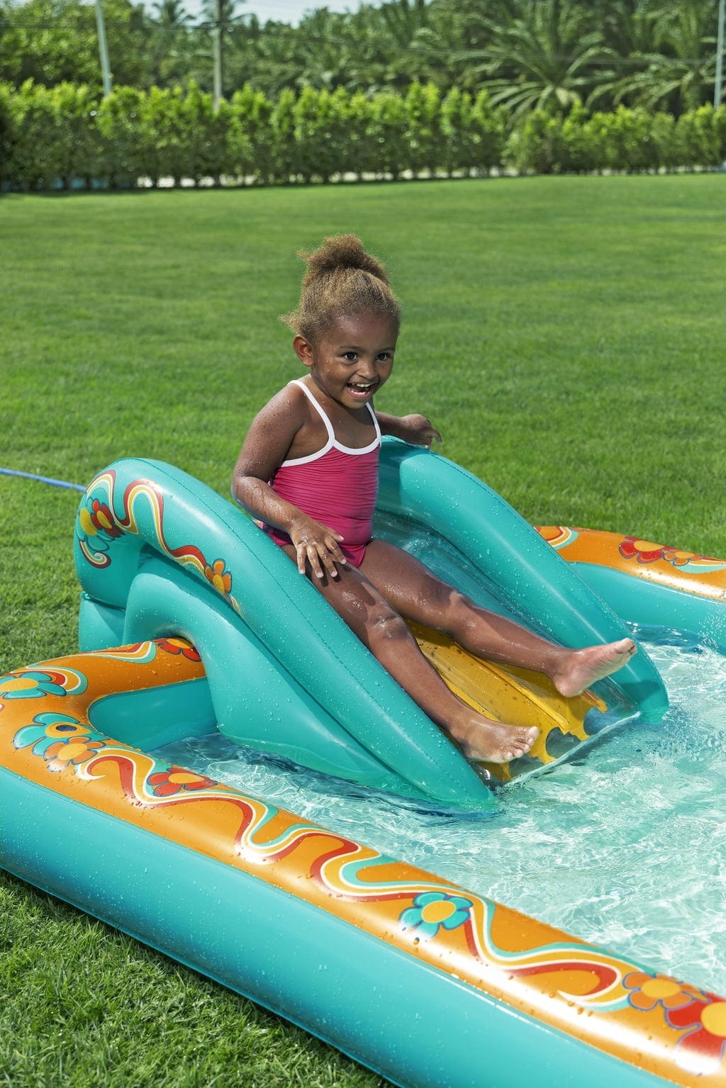 Интегрираният воден спринклер осигурява освежаващо охлаждане, когато слънцето отново весело грее. Страхотната водна пързалка обещава бързи спускания, а надуваемата стена с игра за сортиране предлага интересни предизвикателства за малките мислители. Практичният клапан за източване и предпазните клапани осигуряват лесно управление!