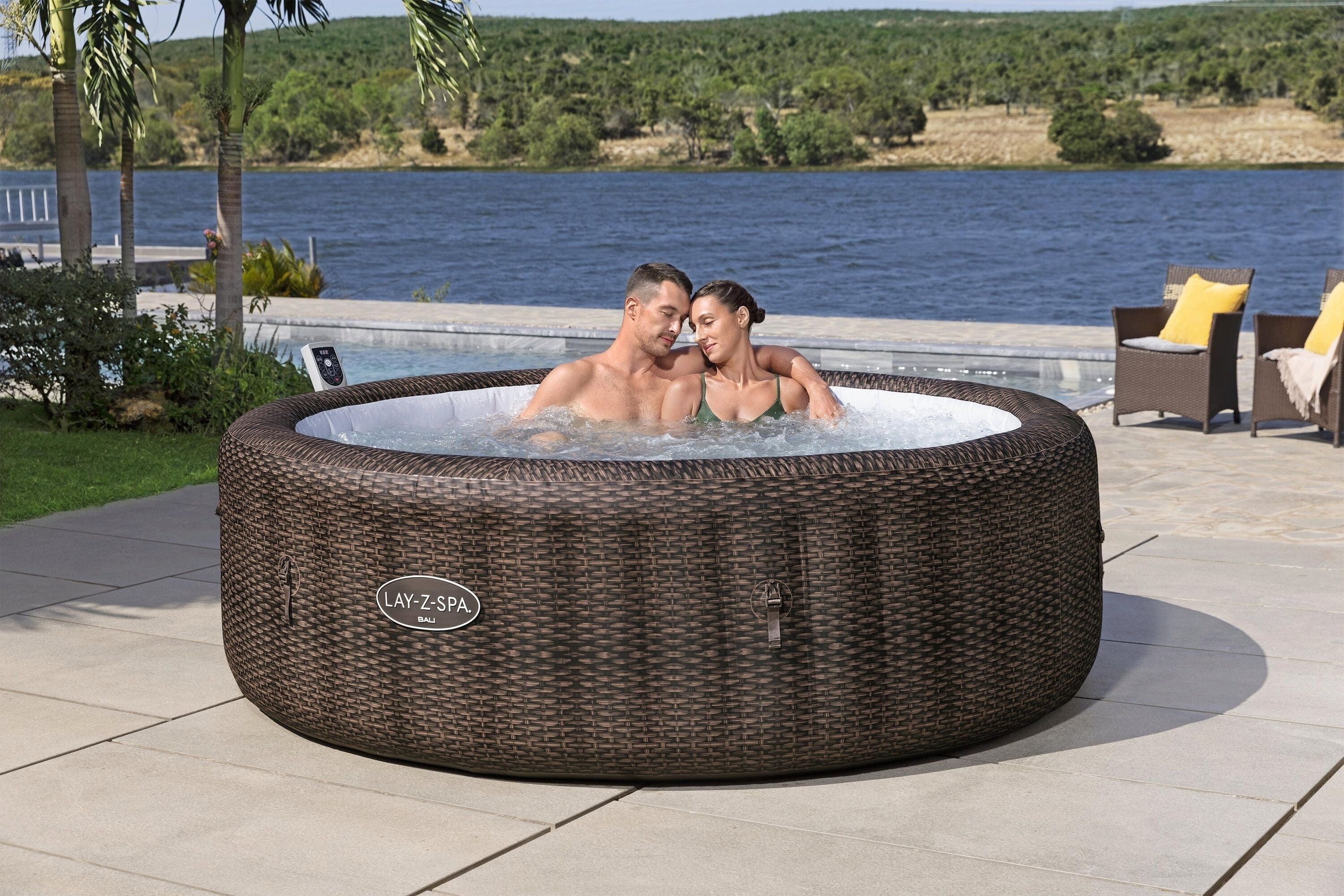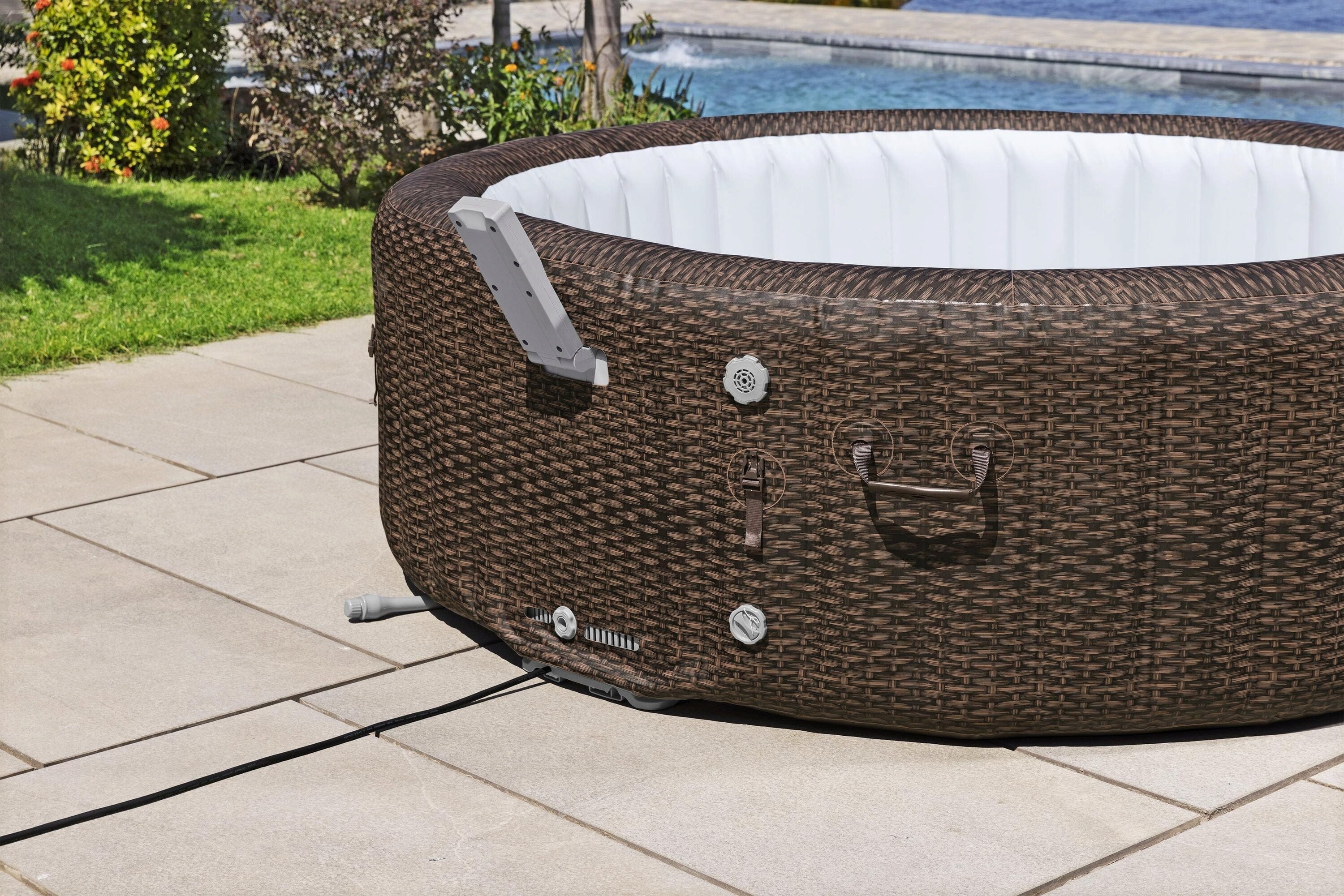 Насладете се на луксозни моменти на уелнес в собствената си градина с LAY-Z-SPA® Bali AirJet от Bestway! Това просторно джакузи с диаметър 216 cm предлага достатъчно място за до седем души. Стилният дизайн в цвят шоколадова ратанова структура се вписва хармонично във всяка външна обстановка. Докато се отпуснете, 180 AirJet™ дюзи осигуряват прекрасно пенливо масажиране! Благодарение на иновативната EnergySense® изолация, вие се наслаждавате на вашата вана особено ефективно, тъй като тази технология прави джакузито до 40% по-енергийно ефективно.