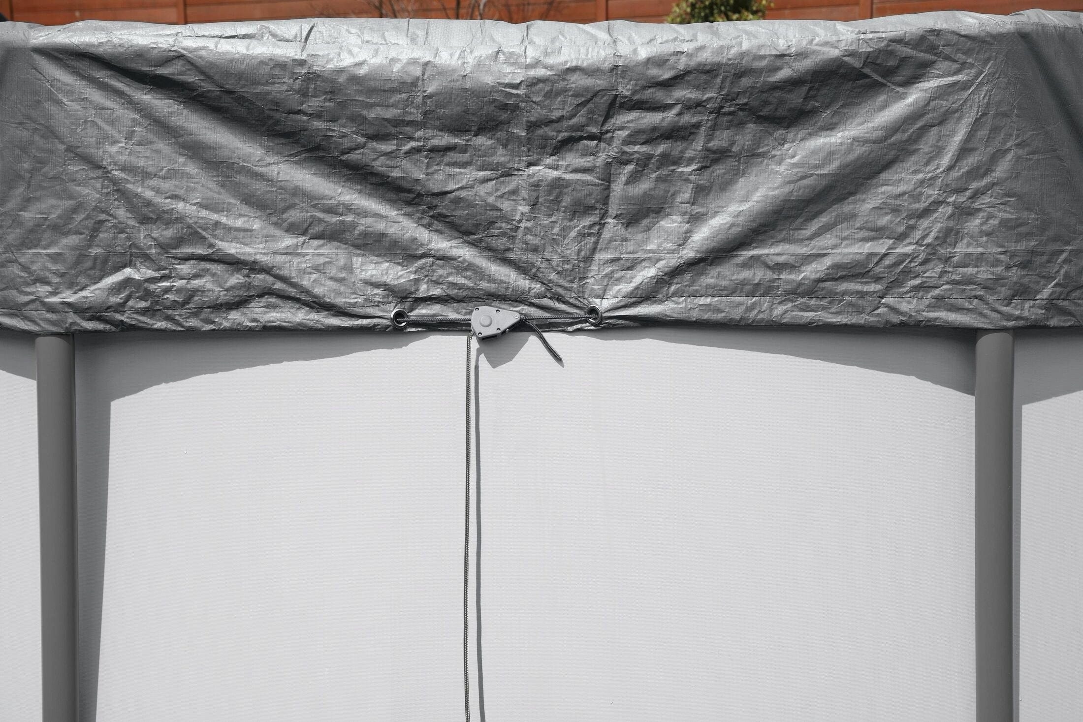 Монтажът е лесен: стабилни въжета за фиксация осигуряват защита от вятър, а интелигентните дренажни отвори предотвратяват натрупването на тежка дъждовна вода върху повърхността и натоварването на материала. Освен това водата в басейна под сивото PE покритие остава чиста и свободна от есенни листа – за безстресов старт на следващия плувен сезон!