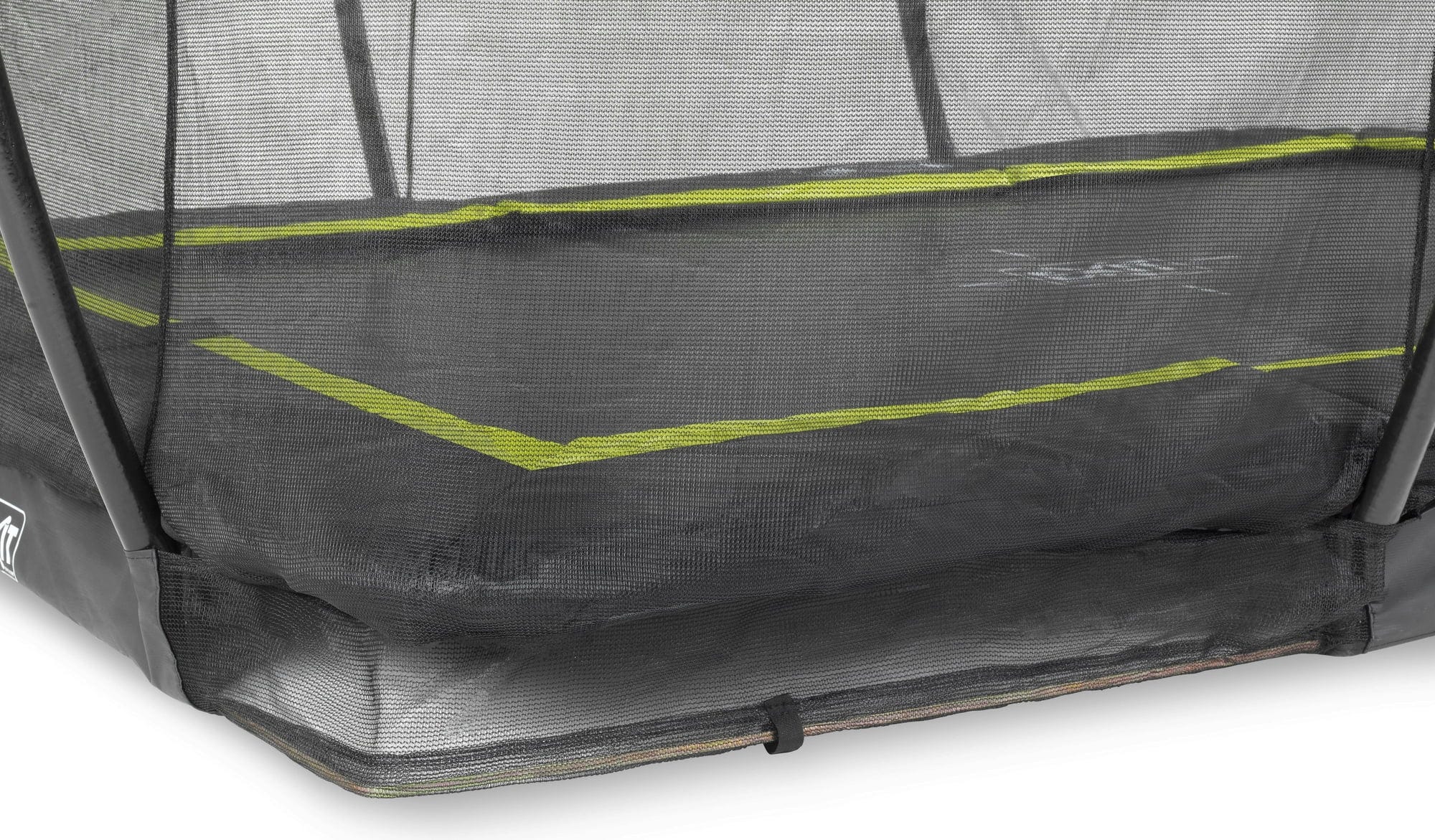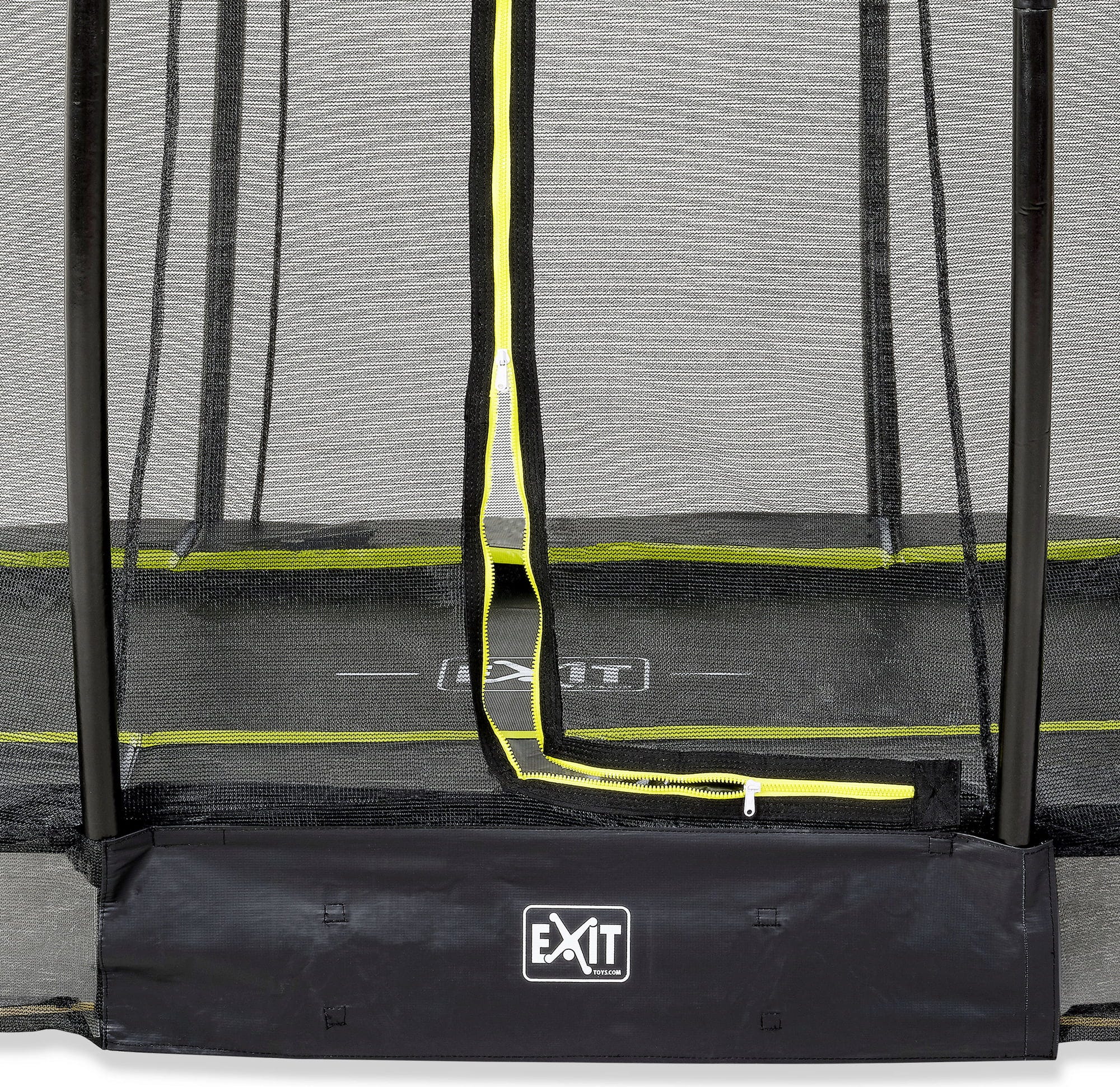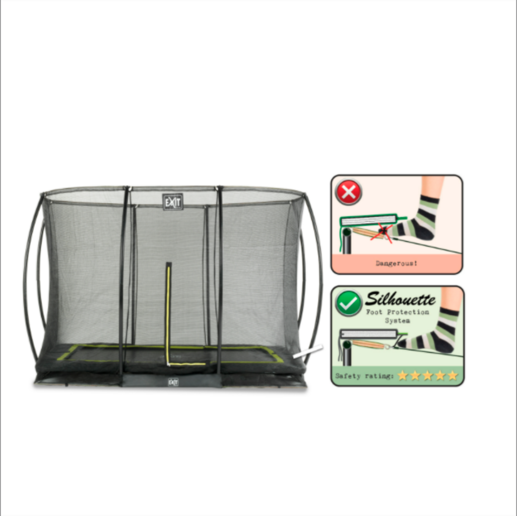 Правоъгълен наземен трамплин от EXIT Toys за висока степен на забавление с върховен комфорт - За да не се притеснявате за безопасността на вашите деца, плътно опъната предпазна мрежа с цип надеждно защитава от изпадане по време на скачане. Черният предпазен ръб допълнително минимизира риска от нараняване, като пълно покрива пружините, към които е закрепено платно за скачање. Предпазителят за крака върху предпазния ръб предотвратява децата ви да попадат с кракате между пружините и да се наранят.