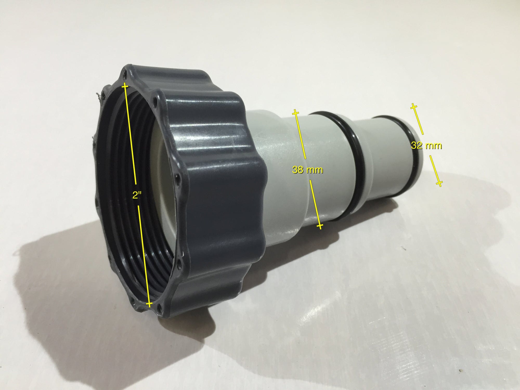 Този адаптер се използва, за да свържете Ø 32 / 38 mm басейнен маркуч, който няма 2" наганка, към продукт на Intex с 2" връзка.