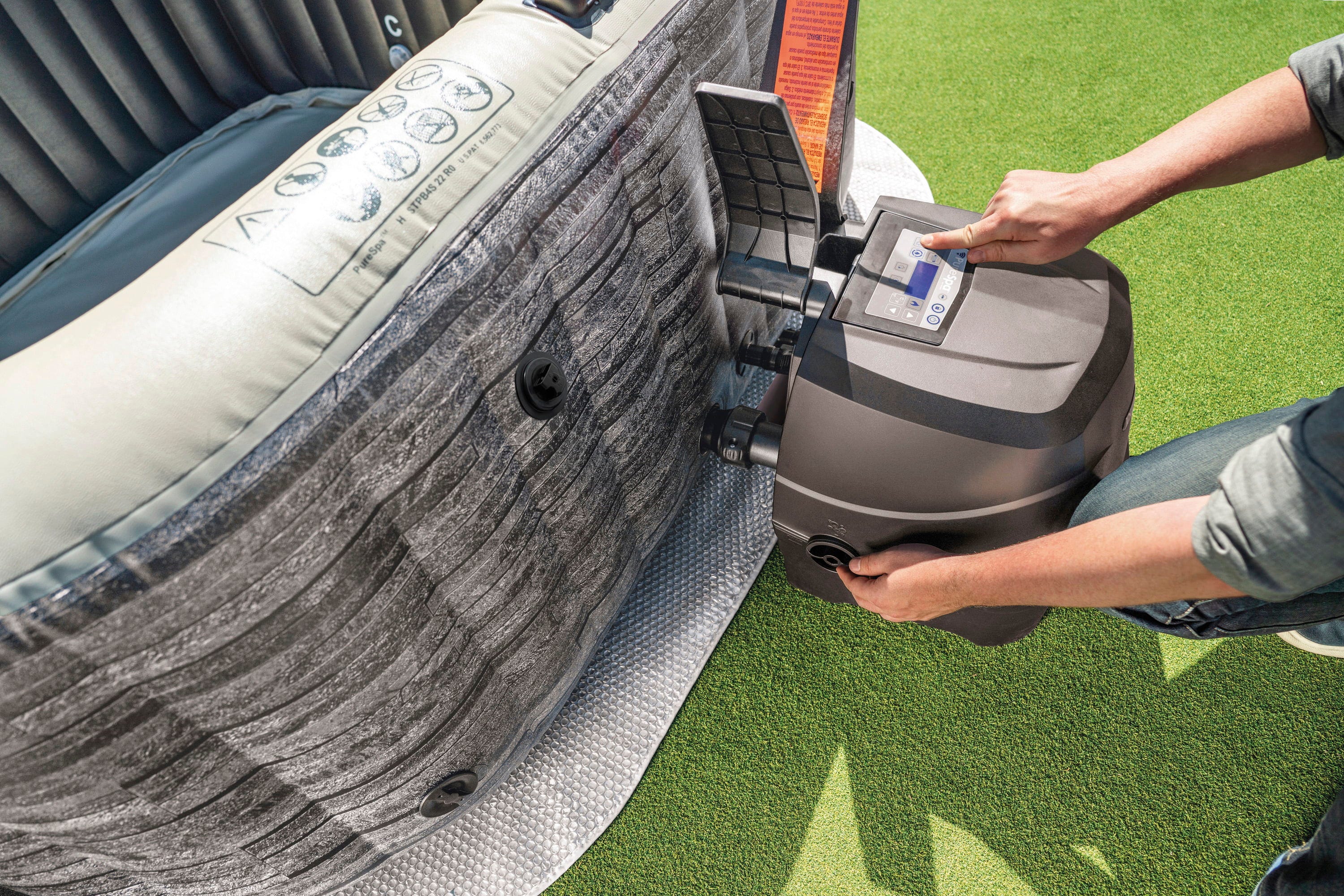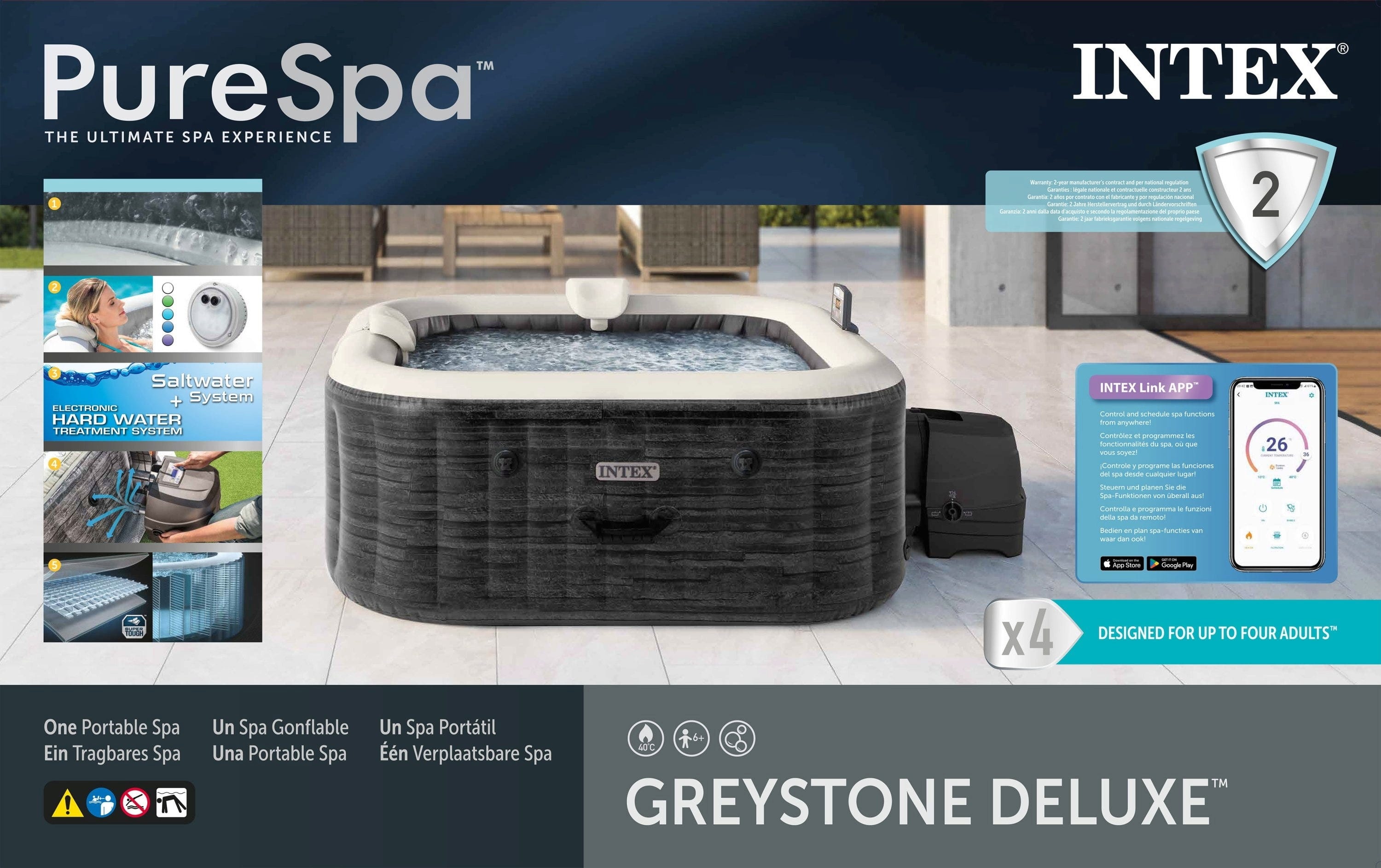 PureSPA Bubble Greystone Deluxe е идеалният компактен уелнес оазис за до четири души и преоткрива понятието за цялостен комплект. Благодарение на вградената система за надуване и безжичното управление чрез контролен панел или Intex Link™ App, монтажът е изключително лесен, а експлоатацията - максимално интуитивна. Насладете се на интензивна релаксация с 140 въздушни дюзи, премиум подглавници и атмосферно LED осветление, докато Fiber-Tech™ технологията осигурява несравнима стабилност. Двойната система за грижа с защита от варовик и нежна за кожата дезинфекция със сол гарантира мека, кристално чиста вода и поддържа джакузито в оптимално състояние за години напред.