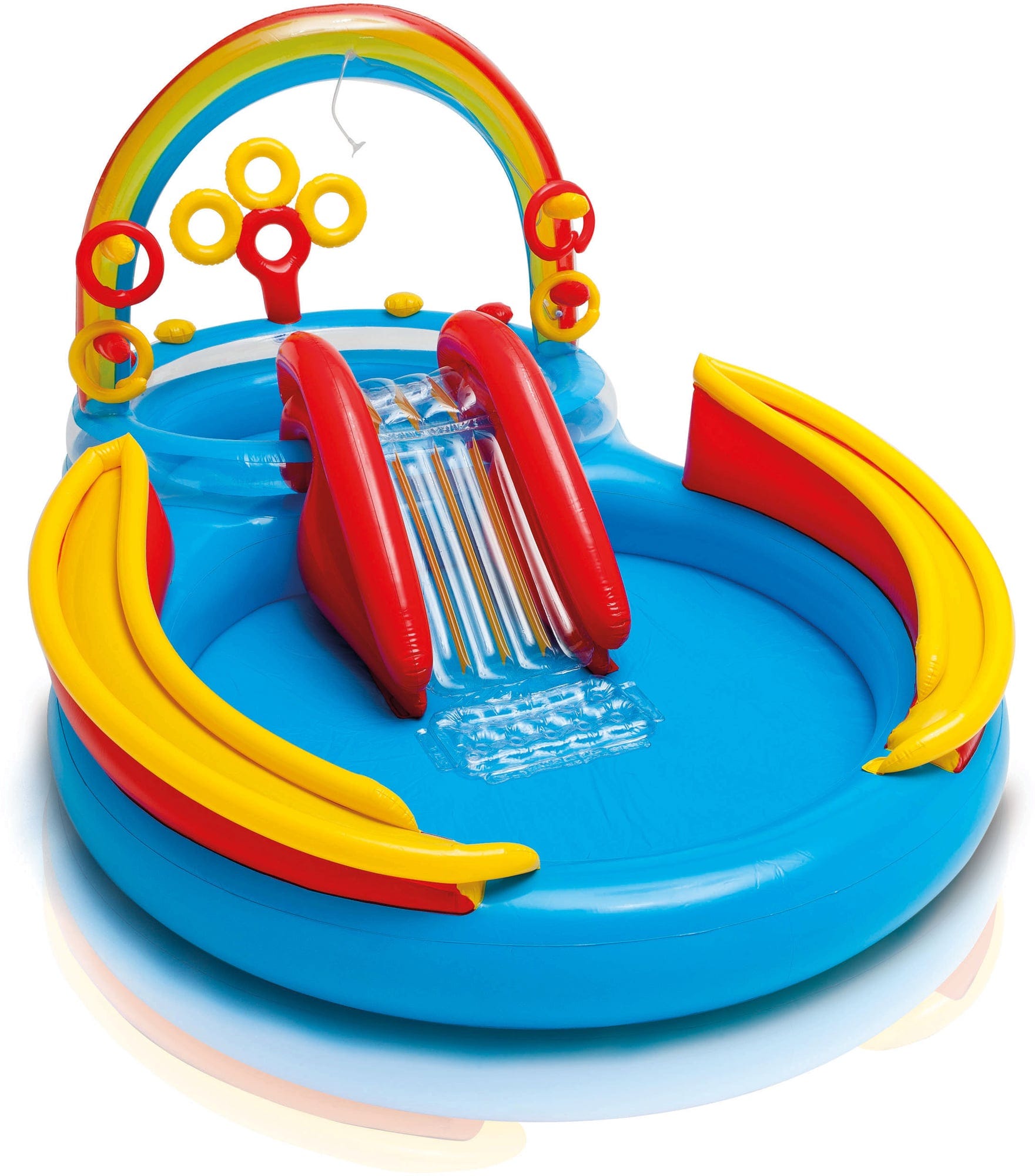 Rainbow Ring Play Center предлага всичко, което децата могат да пожелаят. Размерите на игровата зона са 297 x 193 x 135 см. Включва различни игри с топки и пръстени, водна пързалка, душ с дъга, който може да се свърже с градински маркуч, и всичко това е разделено на два басейна. Голяма басейн съдържа 201 л вода при запълване до 17 см, а малка басейн съдържа 227 л вода при височина на запълване 25 см. И двата басейна са оборудвани с изпускателен вентил. Максималното натоварване на конструкцията е 81 кг. Play Center е препоръчано за деца над 2 години.