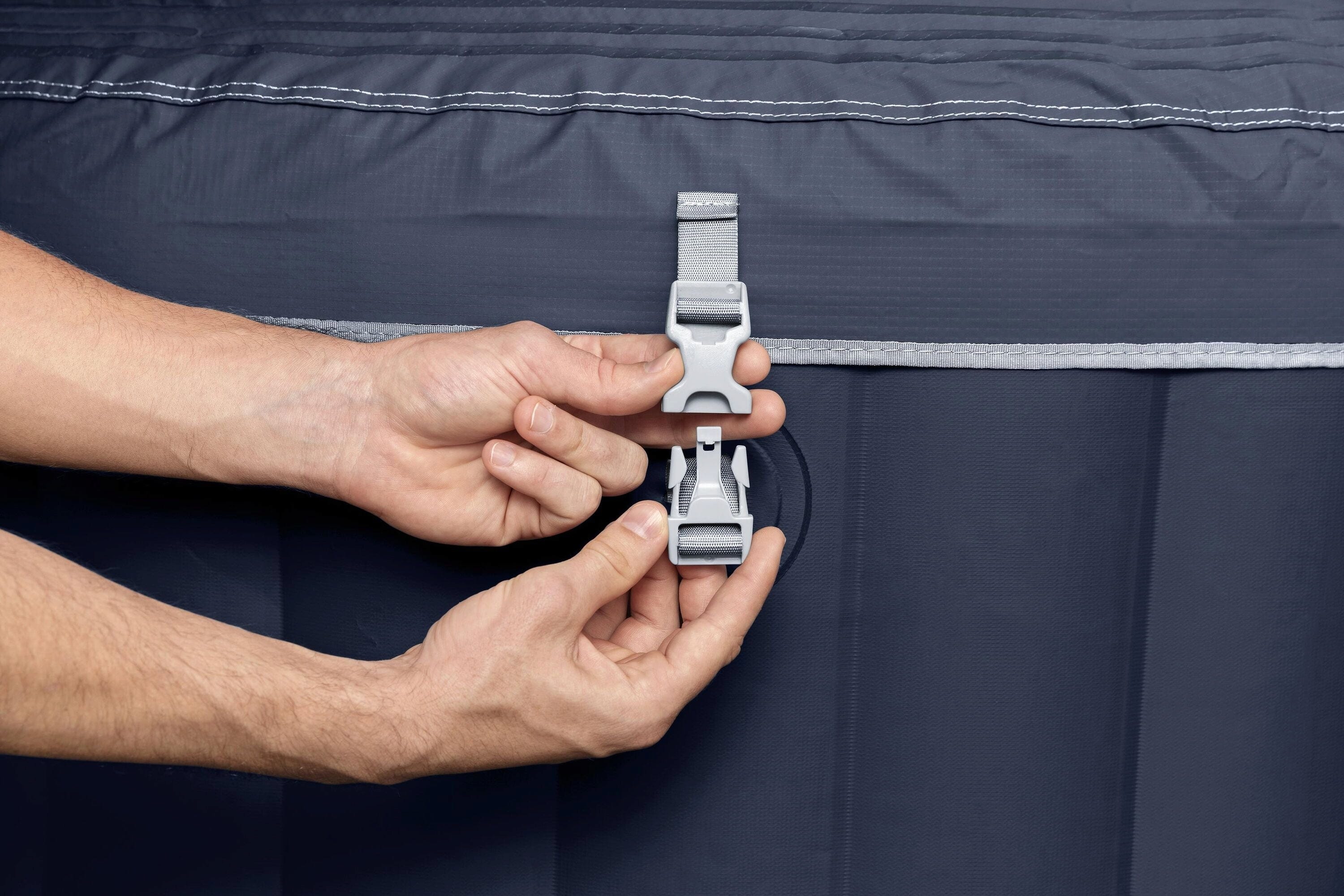 В компактното джакузи LAY-Z-SPA® Miami AirJet от Bestway могат да се поберат до четири човека, за да се насладят на до 40 °C топла вода и да забравят за ежедневните грижи. Докато се отпускате, 120 AirJet™-джета с предварително затоплен въздух нежно масажират мускулатурата ви. Благодарение на иновативната изолация EnergySense® това става особено устойчиво, тъй като системата съхранява топлината значително по-ефективно и спестява до 40% енергия. Комбинацията от устойчиво, 3-слойно TriTech®-материал и стабилна вътрешна конструкция осигурява устойчивост на формата и дълготрайност дори при редовно ползване.