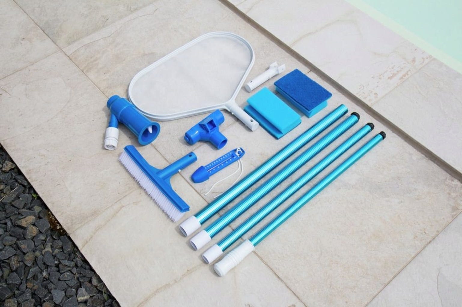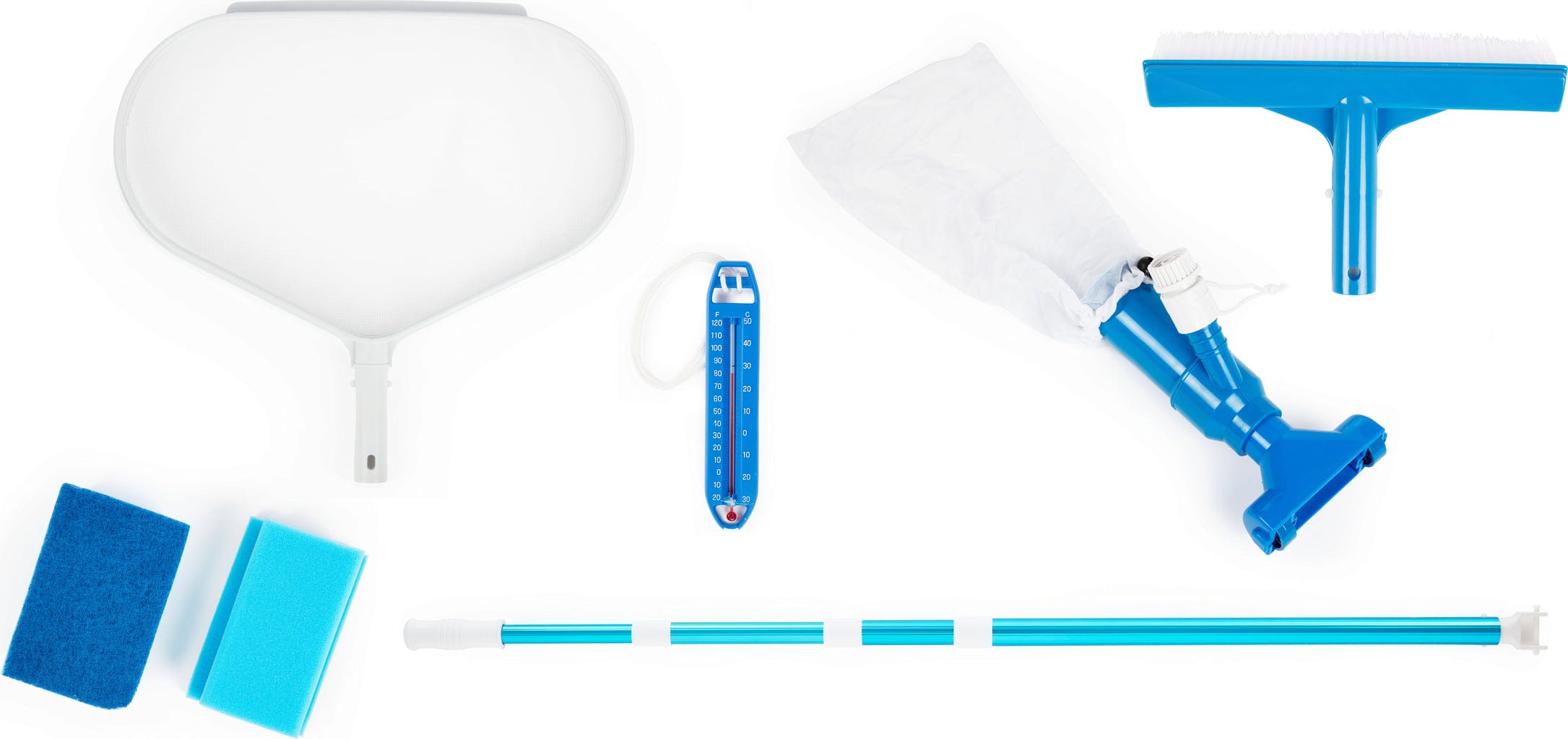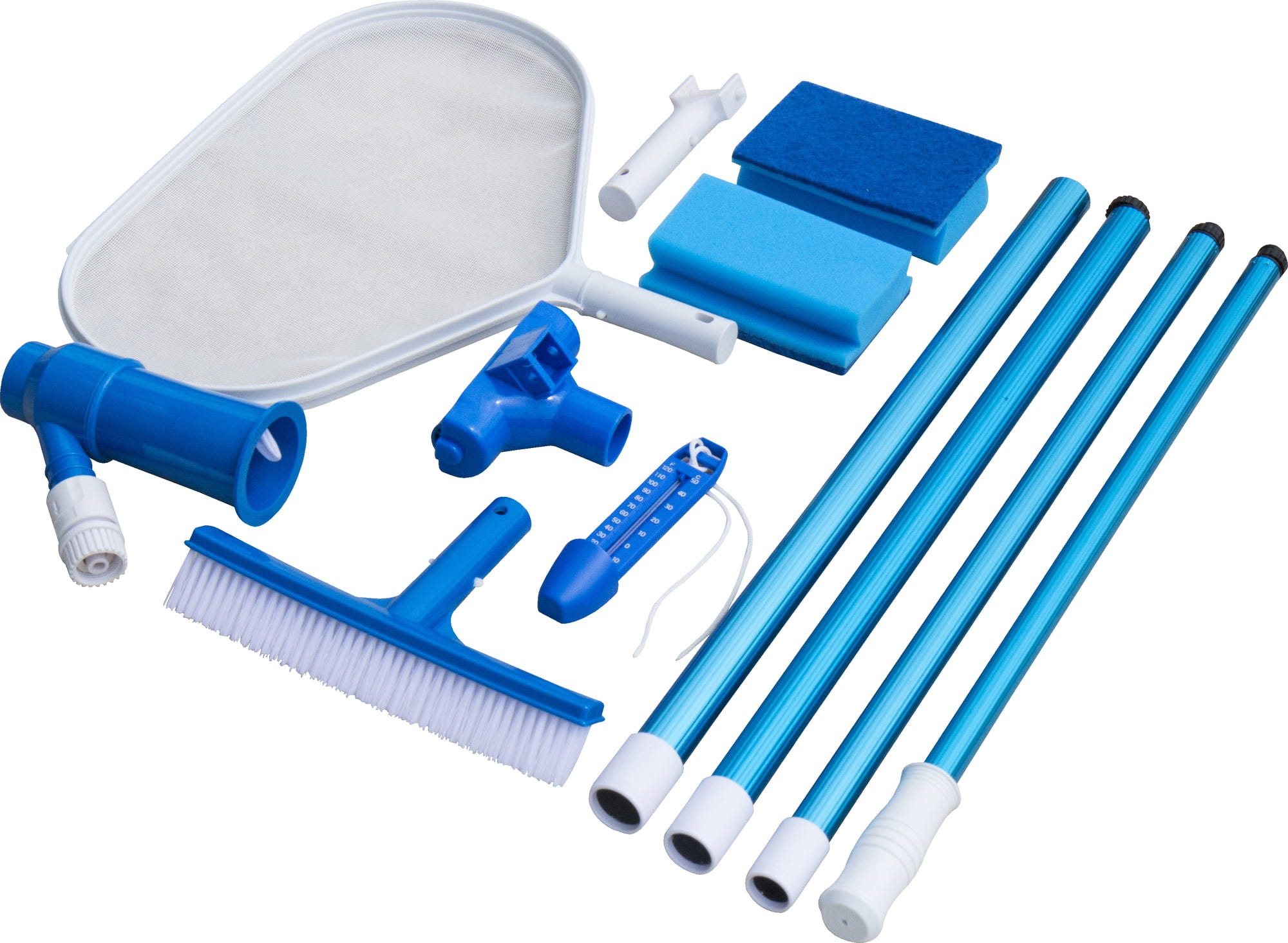 Основният комплект за почистване съдържа голям скуммер за листа, четка за басейн, 4-частична алуминиева телескопична пръчка (макс 2,20 м), прахосмукачка за дъно, термометър и двойна опаковка ръчни четки.
