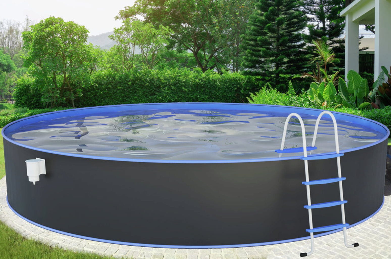 Nuovo Pool комплект кръгъл има размер Ø 350 x 120 cm и воден обем 10 400 литра. Включената в комплекта стълба ви осигурява комфортно влизане. Доставеният скимер се грижи за почистването на повърхността на водата. Здравата, поцинкована, пластмасово-покрита стоманена стена е с дебелина около 0,4 мм.