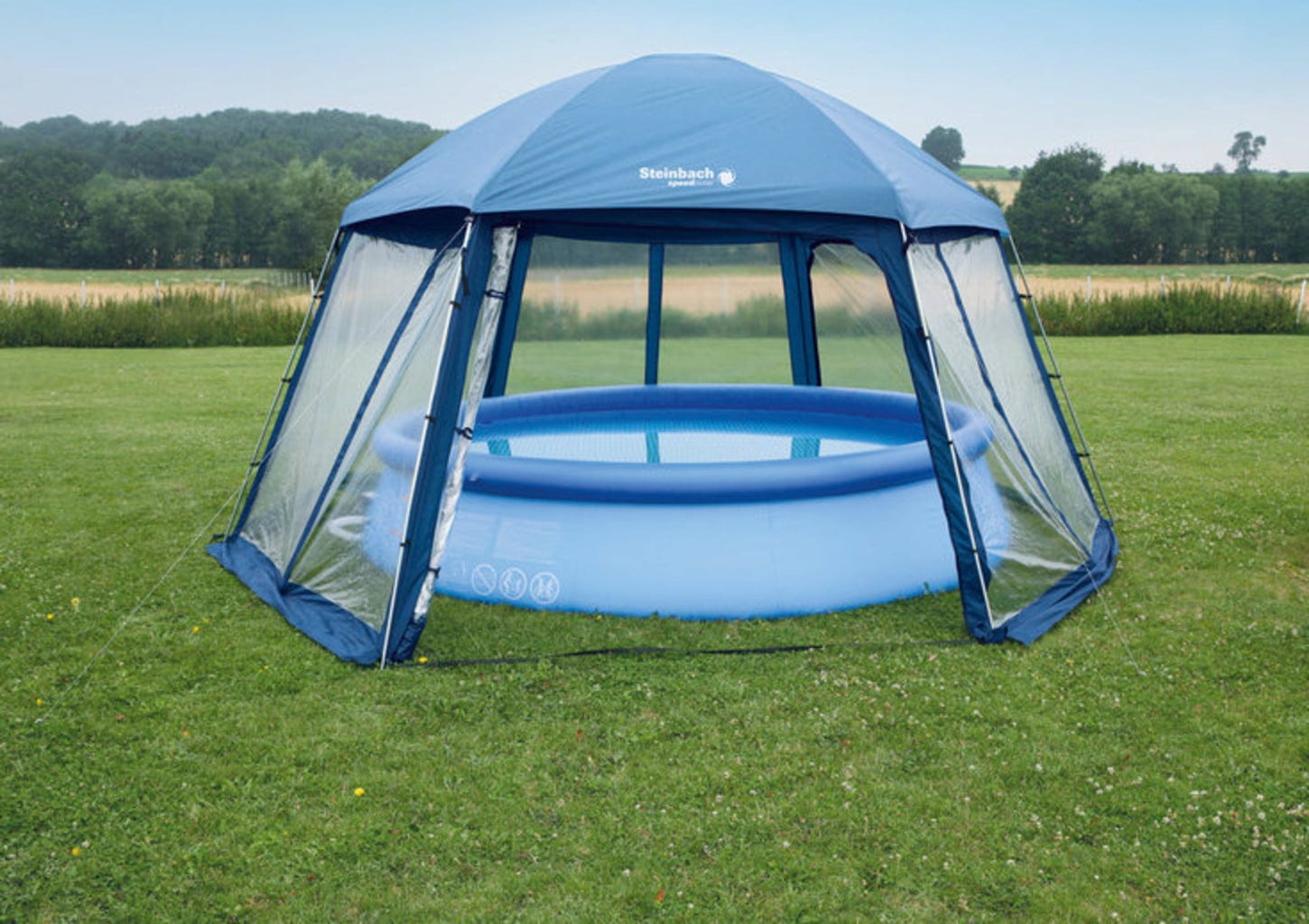 Големият покрив за басейни е подходящ за надземни басейни с диаметър до 400 cm и служи като защита от слънцето, която може да се използва и за зоната ви за сядане. Размерите на тази защита от слънцето са 500 x 433 x 250 cm. Монтажът е прост и бърз, а покривът може лесно да бъде преместван, дори и когато е монтиран, благодарение на ниското си тегло. Освен това, покривът ускорява загряването на водата в басейна и предотвратява охлаждането ѝ от дъжд.