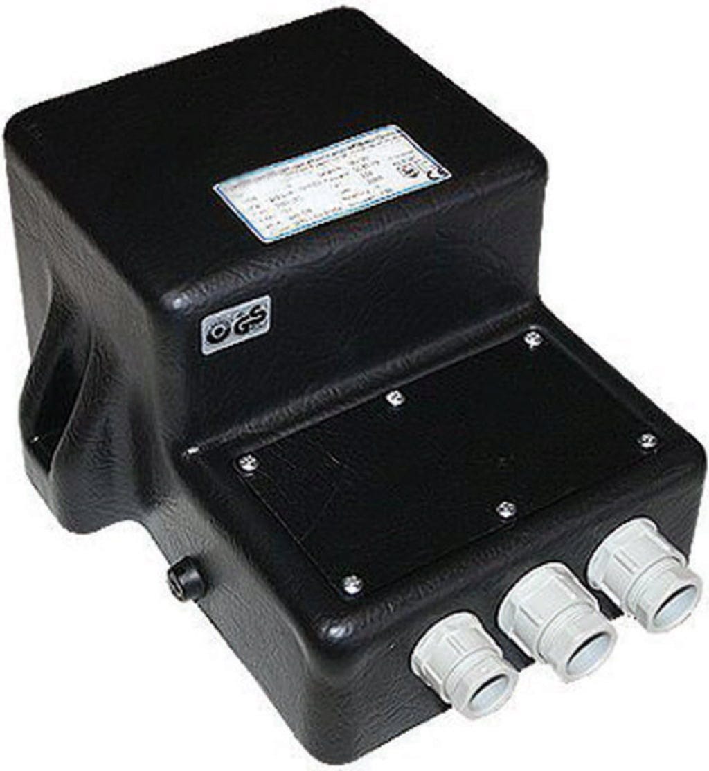 Еднофазен трансформатор за безопасност за прожектори за плувни басейни съгласно VDE 0551, в пълнолят корпус с IP 65, разделни намотки, с първичен предпазител и температурен ограничител.