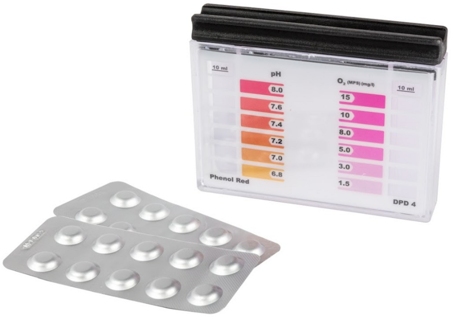 Този комплект е предназначен за бързо и лесно измерване на стойностите на pH и O₂. Оптималното съдържание на активен кислород е между 5,0 – 10,0 mg/l и трябва да се измерва поне веднъж седмично.