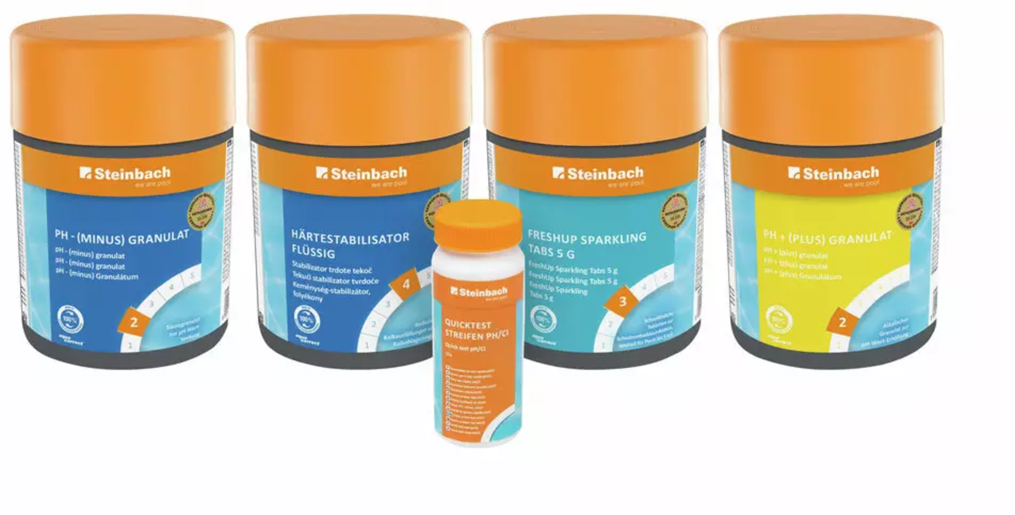 Всичко, което ви е необходимо за перфектно обработване и дезинфекция на водата в джакузито, е включено в този комплект. Гарантирана е без бактериално и оптимално качество на водата. В комплекта са включени средства за увеличаване на pH стойността, както и за намаляване на pH стойността. За борба с неприятните варовикови отложения действа стабилизаторът на твърдостта на водата, а включените в комплекта мултифункционални таблетки са за дезинфекция. За проверка на качеството на водата служат приложените тест ленти.