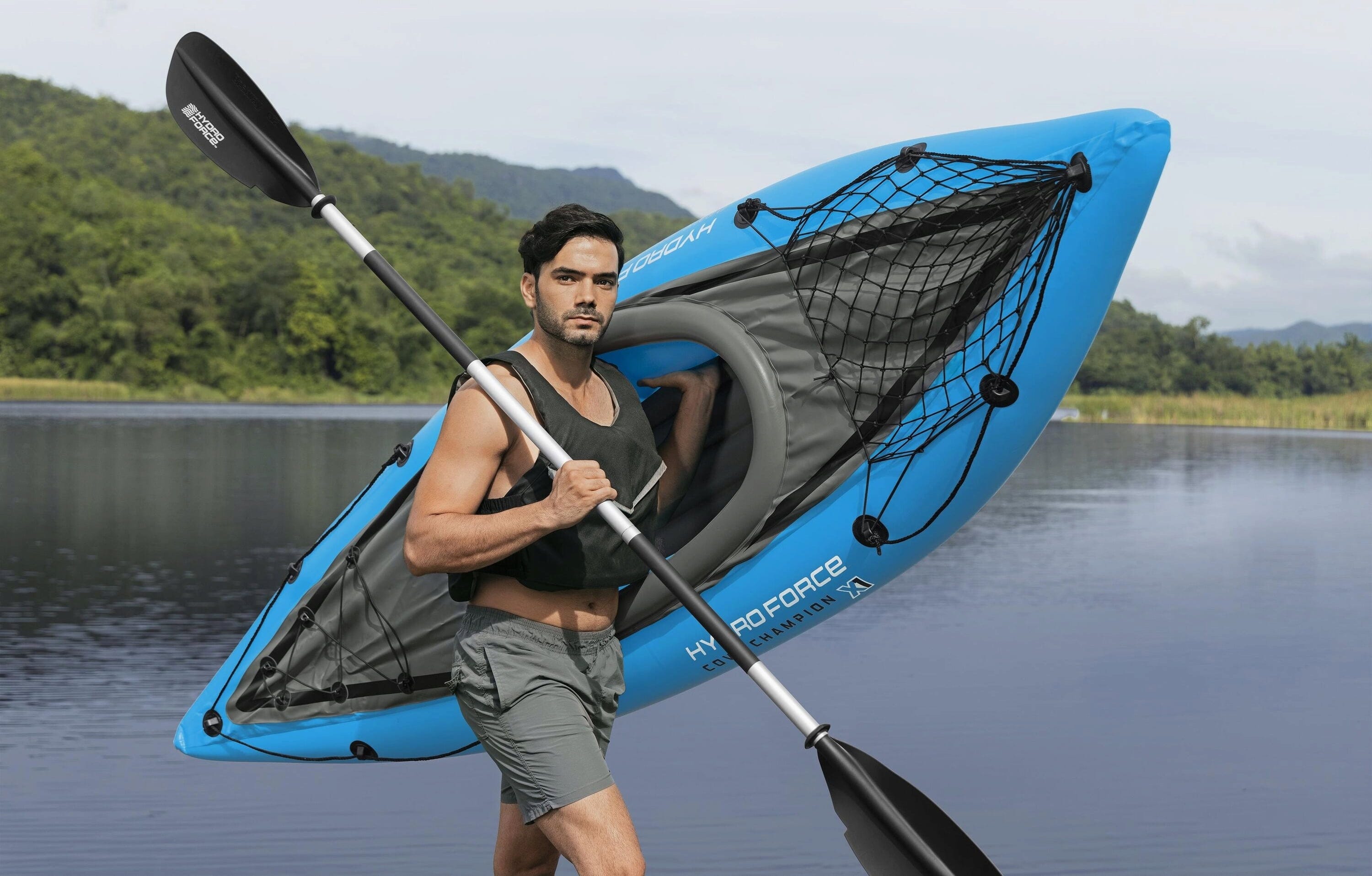 O směrovou stabilitu se starají dvě odnímatelné ploutve, které lze přizpůsobit podle typu vody. Praktické elastické popruhy na přídi a zádi poskytují prostor pro uložení vybavení nebo zásob. Součástí sady je také hliníkové pádlo o délce 230 cm a ruční pumpa AirHammer™, takže je kajak připraven k okamžitému použití. Po použití lze kajak díky madlům a rychlovypouštěcím ventilům snadno přenášet a uložit do přiložené tašky s úsporou místa.
