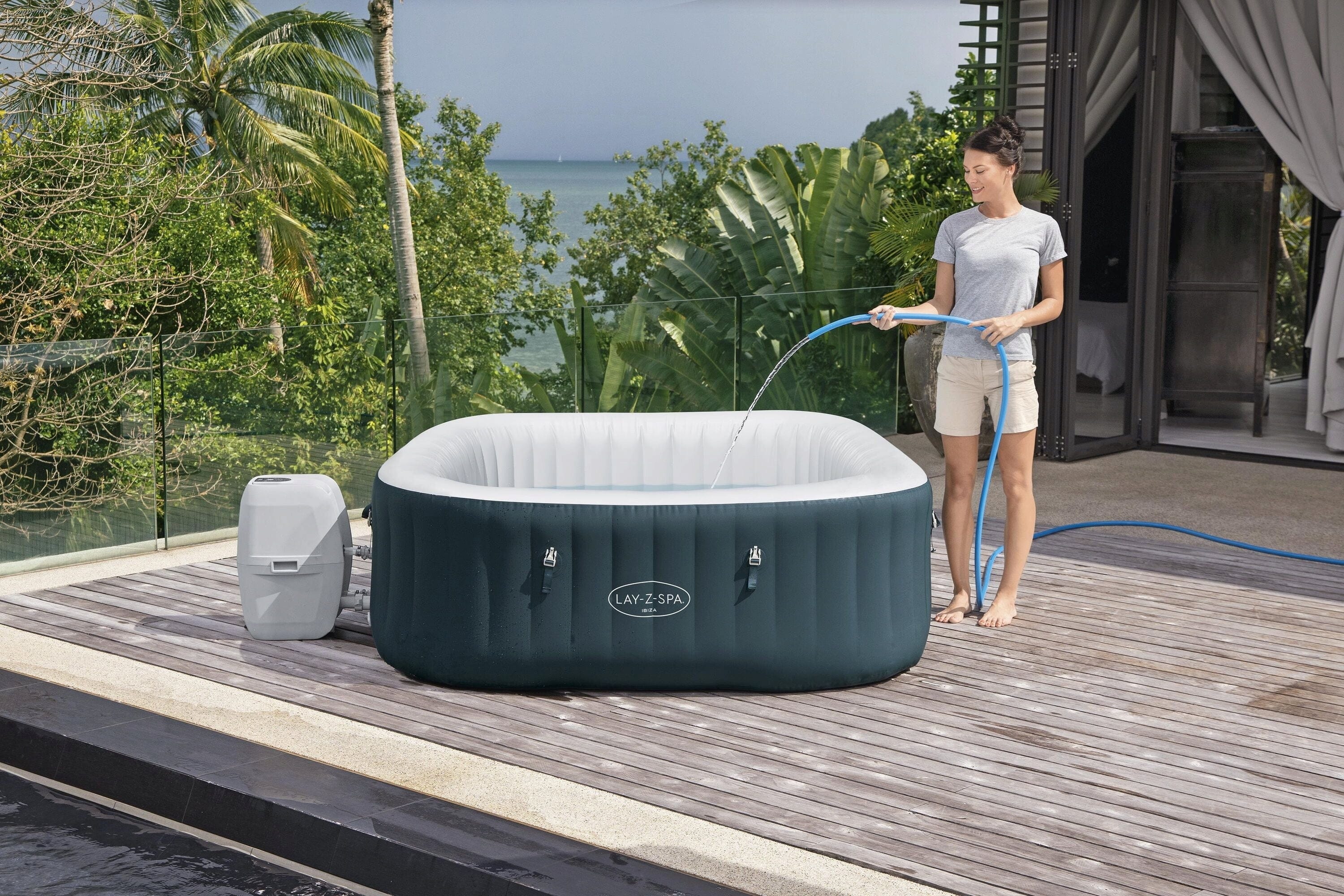 Ovládání je pohodlné, díky výklopnému digitálnímu panelu, pomocí něhož si můžete svůj wellness zážitek naplánovat až 40 dní dopředu díky úspornému časovači. Na vířivku Ibiza AirJet se můžete spolehnout i v chladných dnech, integrovaný systém ochrany proti mrazu automaticky přihřívá vodu od 6 °C, a tím chrání technické komponenty před poškozením. O bezpečnost se stará systém uzemnění, proudový chránič a dětsky bezpečné uzávěry krytu. Díky multifunkční pumpě, která slouží také jako odkládací plocha a držák nápojů, je sestavení vířivky rychlé a zcela bez použití nářadí.