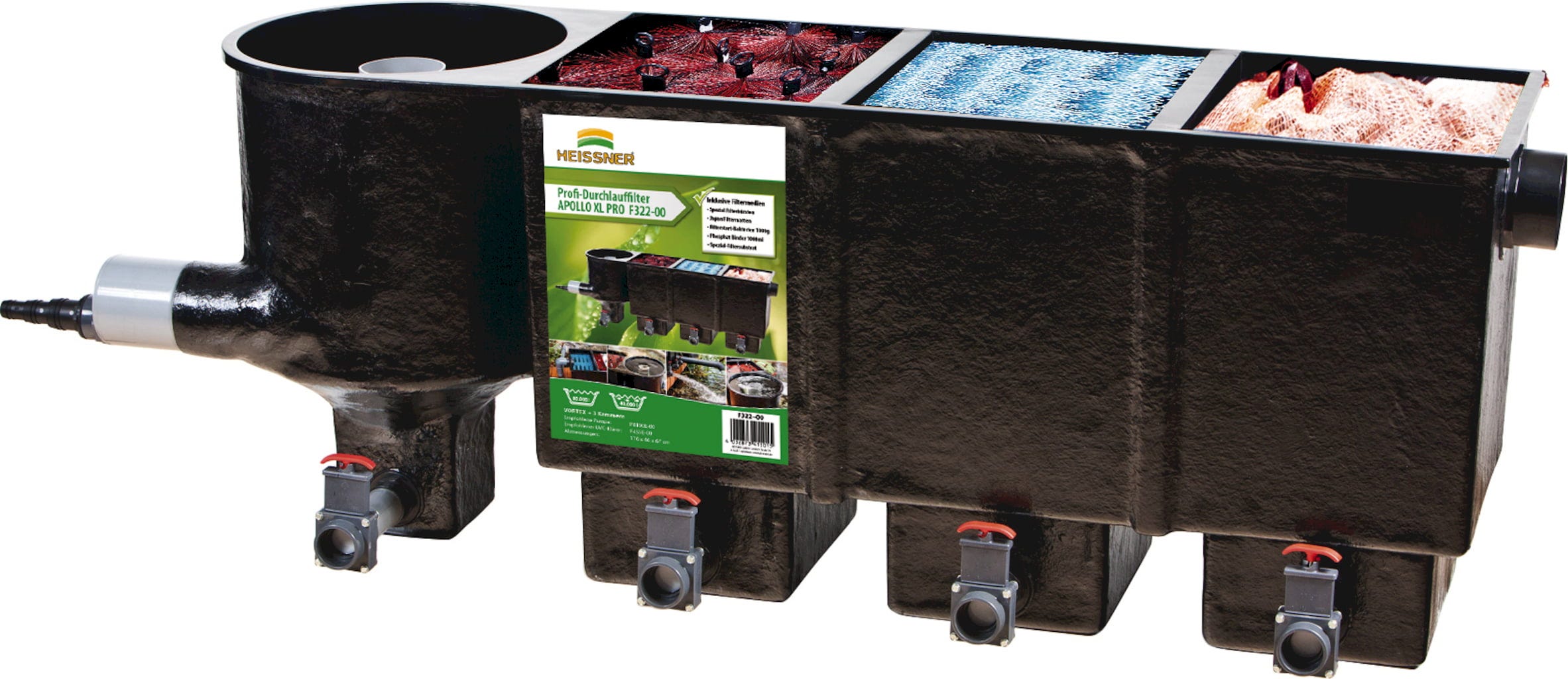 Průtokový jezírkový filtr HEISSNER Apollo XL Pro je prémiový průtokový filtrační systém pro zvláště náročné projekty jezírek. Systém využívá vysoce účinný 4stupňový princip: Vortexová usazovací komora nejprve pomocí odstředivé síly odstraňuje hrubé nečistoty, poté voda prochází třemi specializovanými filtračními komorami. Díky kvalitním tahovým šoupátkům na každé komoře lze nahromaděný kal snadno a kontrolovaně vypustit. Rozsáhlá profesionální sada filtračních médií vytváří vhodné prostředí pro bakterie Nitrosomonas, které se podílejí na přirozeném rozkladu škodlivých látek ve vodě jezírka.