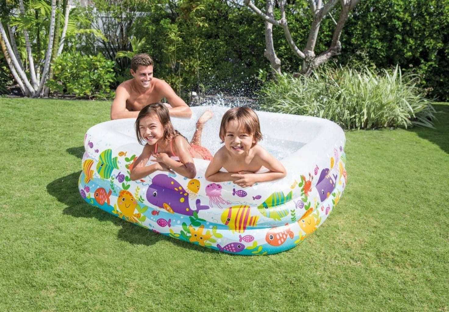Barevné motivy na vnější straně bazénu zvou děti ke zvláštnímu druhu vodní zábavy. Bazén o rozměrech 159 x 159 x 50 cm navozuje pocit, jako byste seděli s rybami v akváriu. Extra široké boční stěny poskytují ochranu a stabilitu. Objem vody bazénu činí 424 l při výšce naplnění 36 cm. Bazén je vhodný pro děti od 3 let.