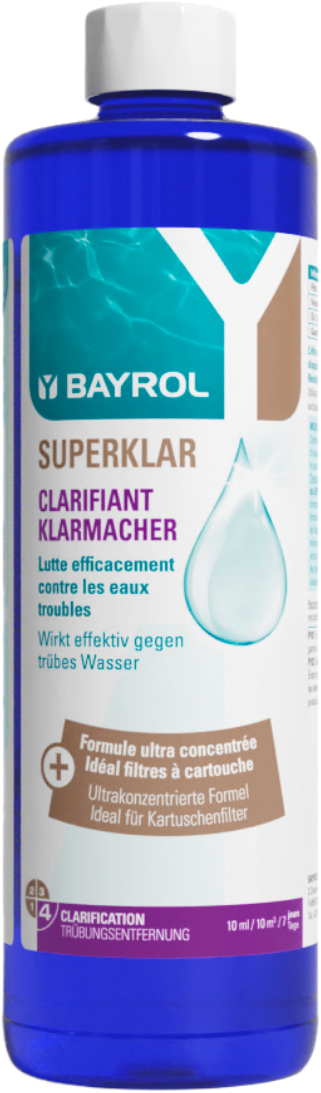 - 10 ml Superklar pro 10 m³ unverdünnt bei laufender Umwälzpumpe direkt ins Poolwasser geben