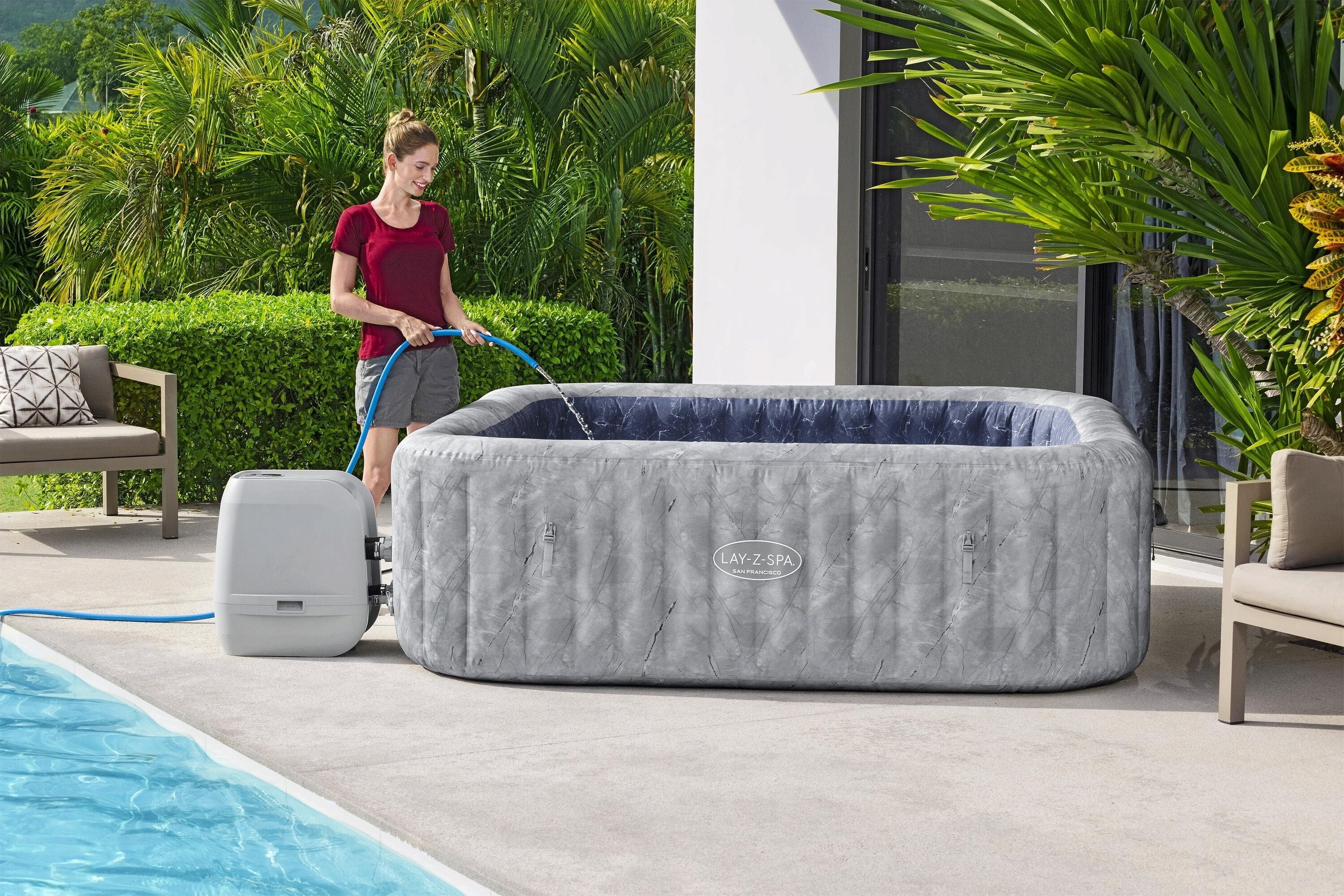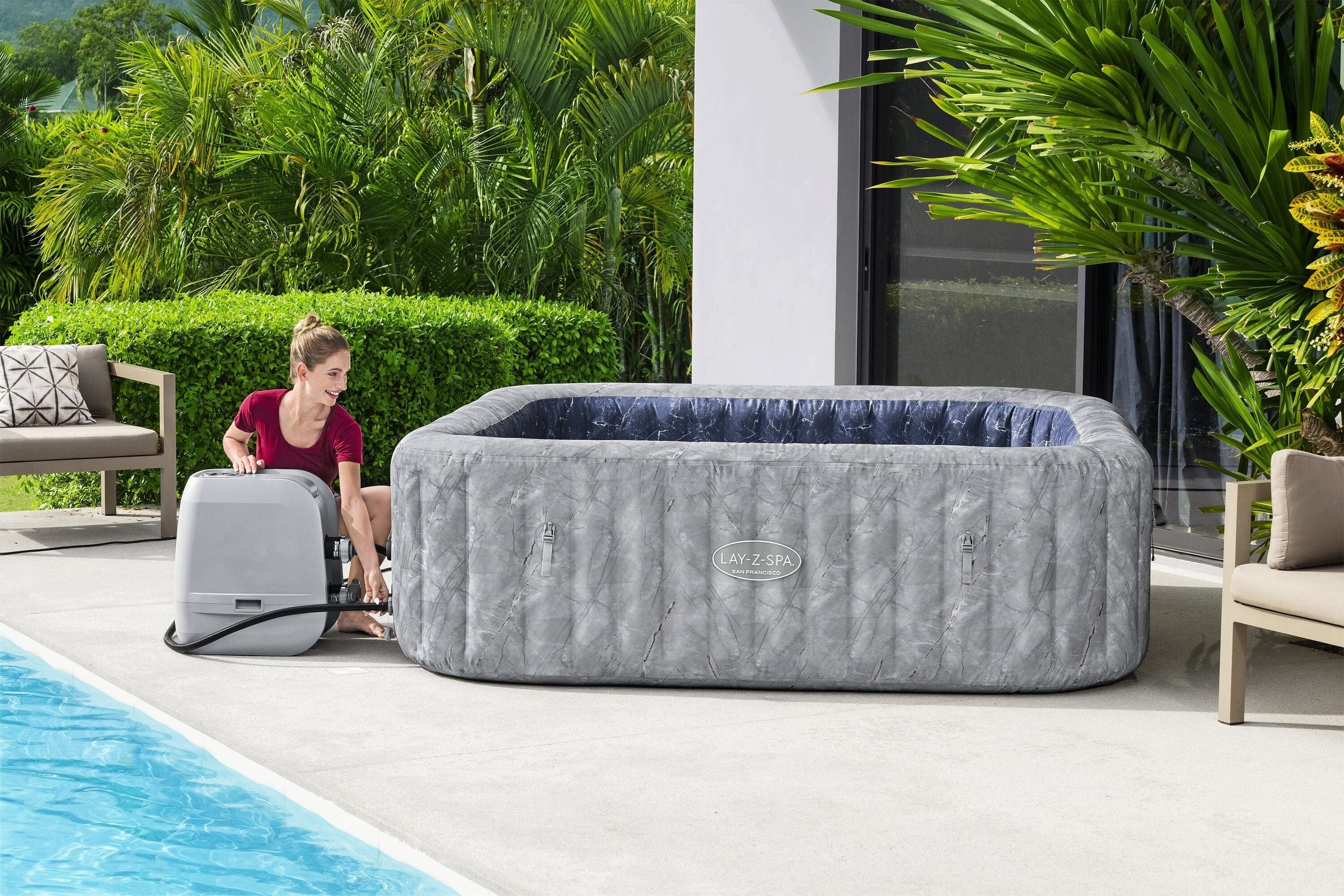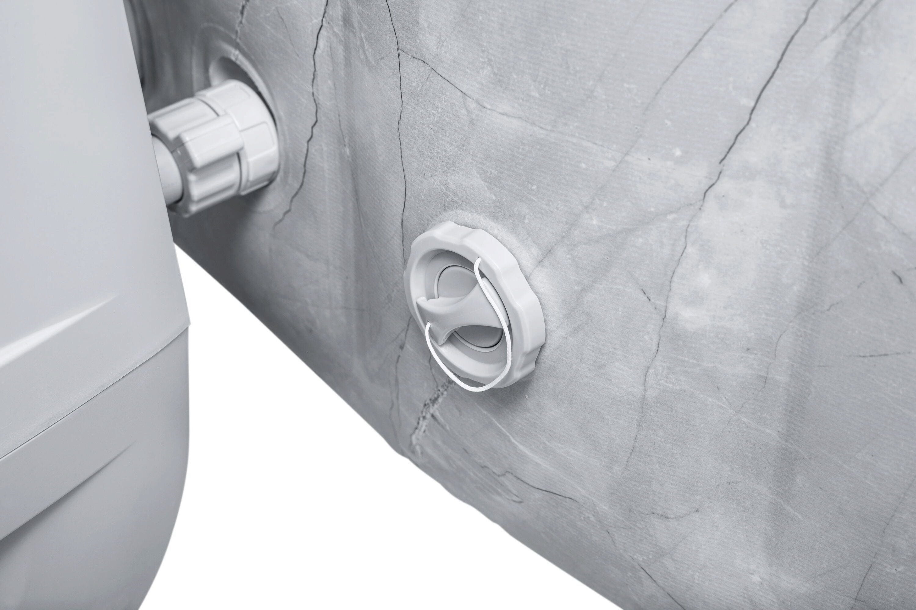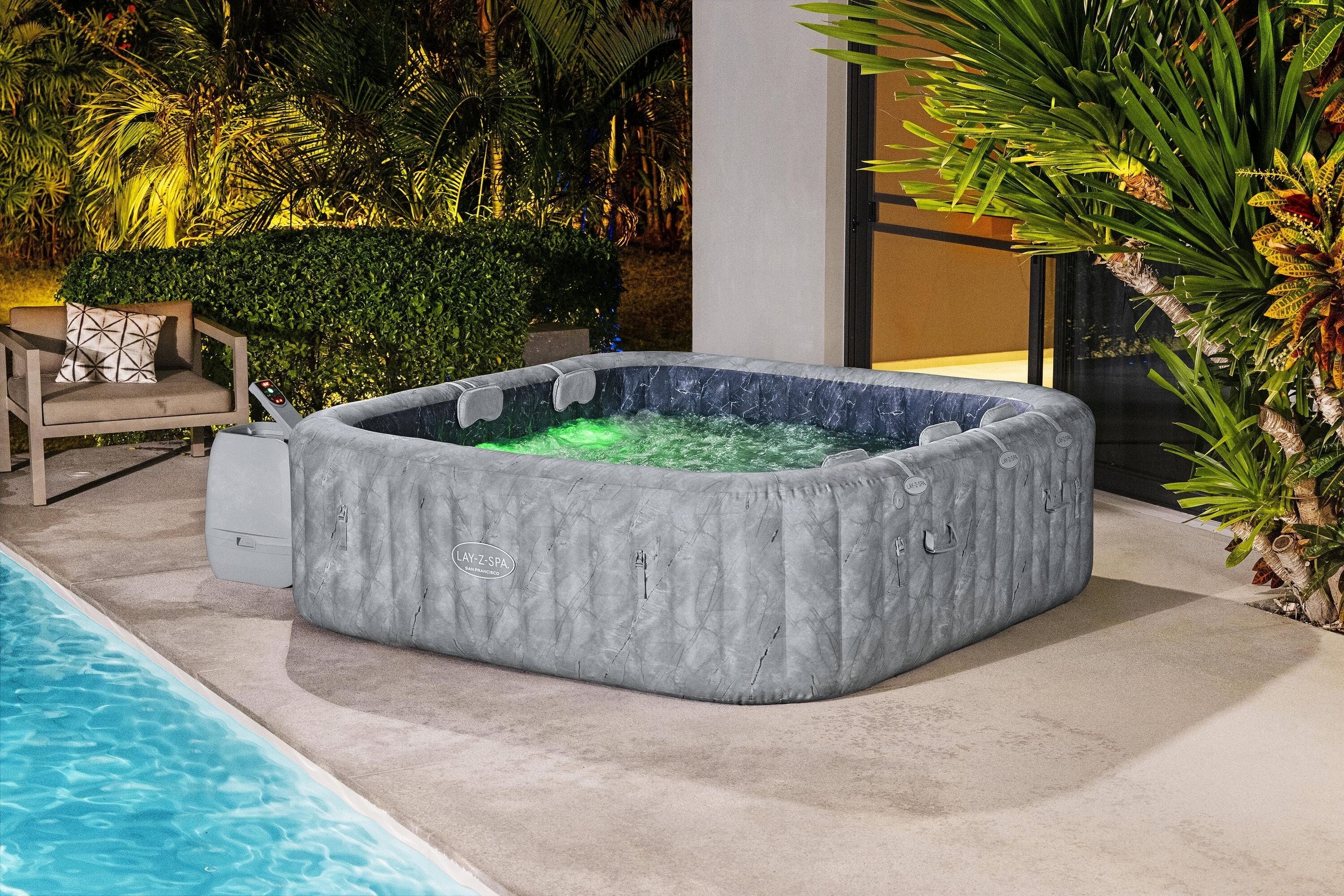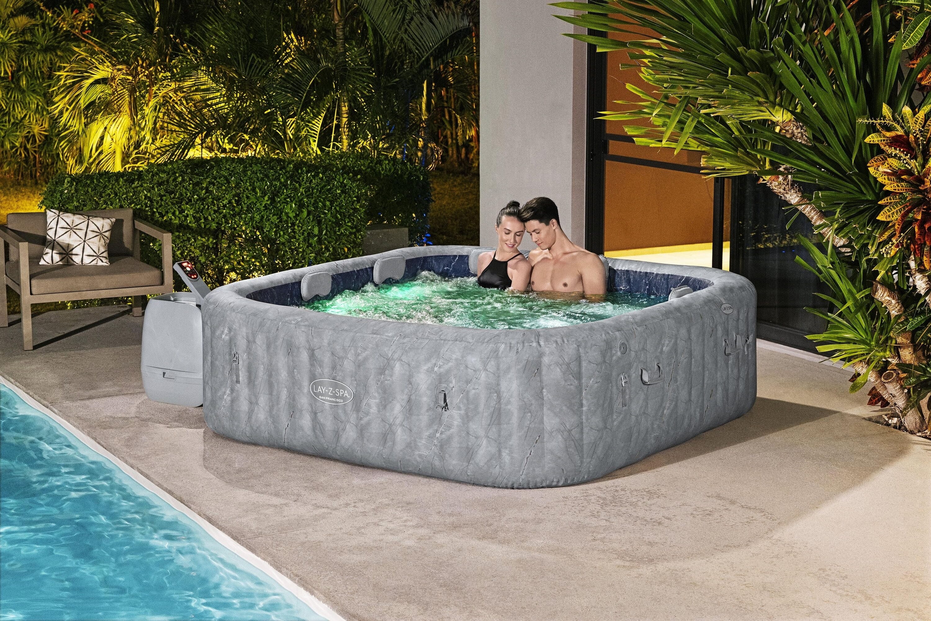 Mit dem LAY-Z-SPA® San Francisco HydroJet Pro™ holst du dir das ultimative Spa-Erlebnis für bis zu 7 Personen direkt nach Hause! Dieser großzügige Whirlpool besticht nicht nur durch seine edle samtgraue Marmor-Optik, sondern ist dank der innovativen EnergySense®-Isolierung auch noch 40 % energieeffizienter als vergleichbare Modelle. Du genießt eine maßgeschneiderte Massage aus einer Kombination von 10 kraftvollen HydroJet™-Düsen und 180 AirJet™-Düsen, während du dich auf den ergonomischen Liegeflächen oder der integrierten Sitzbank entspannst.