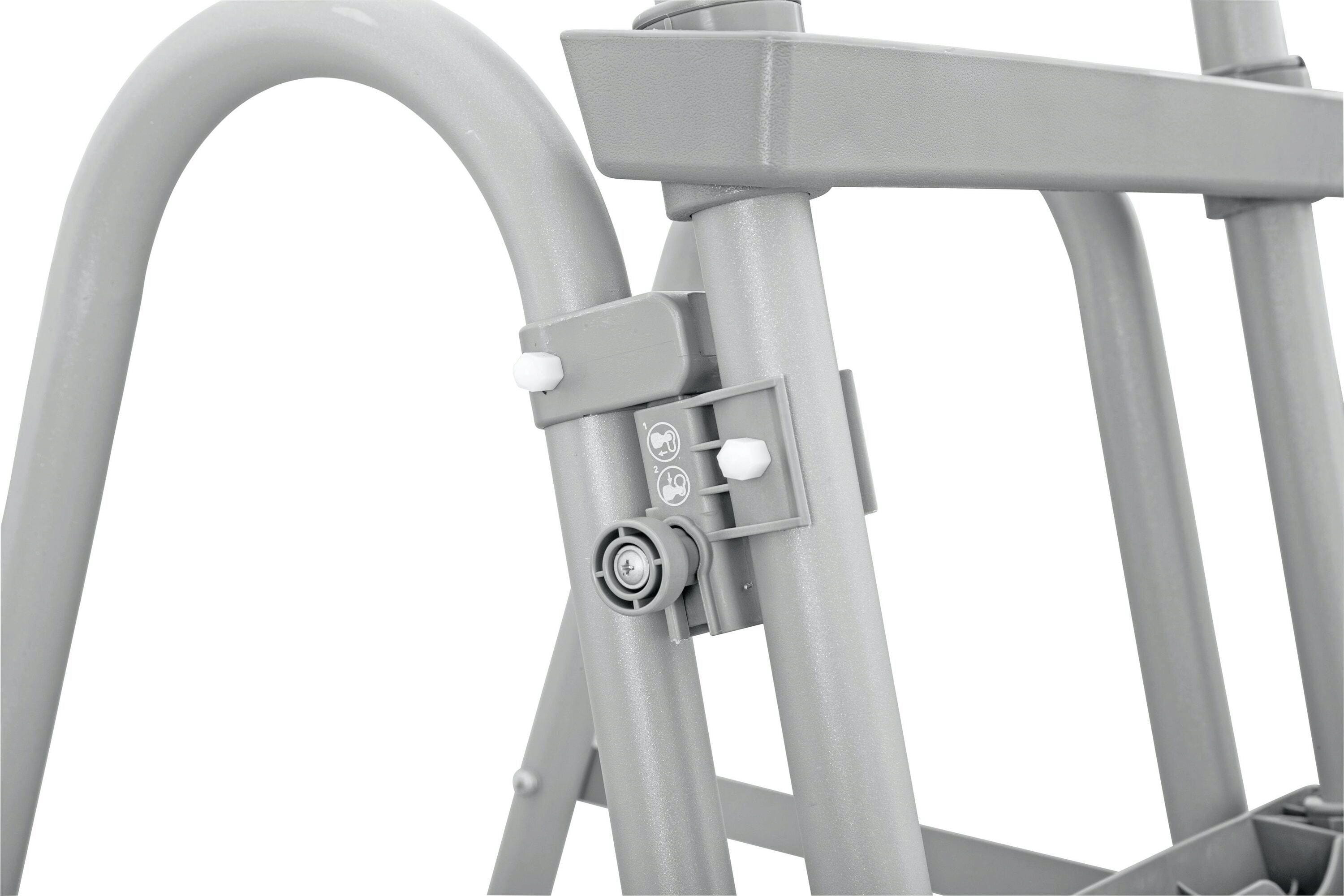 Der äußere Teil der Leiter lässt sich mit nur wenigen Handgriffen hochklappen und sicher fixieren, sodass Kinder nicht unbefugt in das Becken klettern können. Die insgesamt vier robusten Kunststoffstufen bieten dir jederzeit einen festen Halt, während die Leiter mit einer beeindruckenden Tragfähigkeit von bis zu 150 kg punktet.