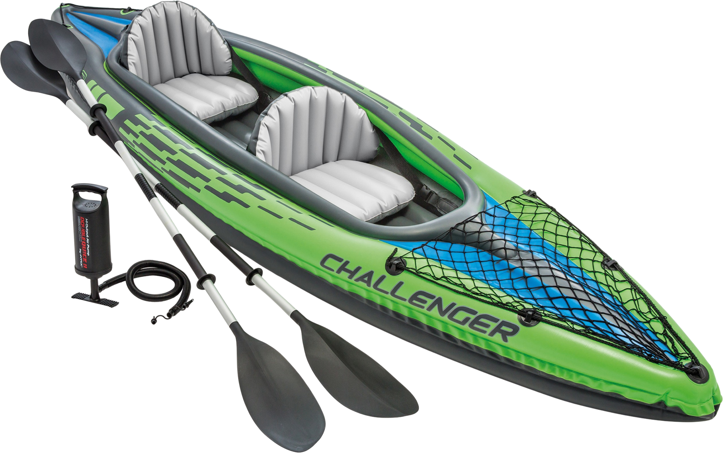 Das INTEX Challenger K2 ist ein sportliches Luftkajak für zwei Personen, das speziell für Einsteiger und Hobby-Paddler auf ruhigen Seen oder Flüssen entwickelt wurde. Im Lieferumfang sind eine Finne, zwei Alu-Paddel (218 cm), eine leistungsstarke Handpumpe und eine Tragetasche enthalten.