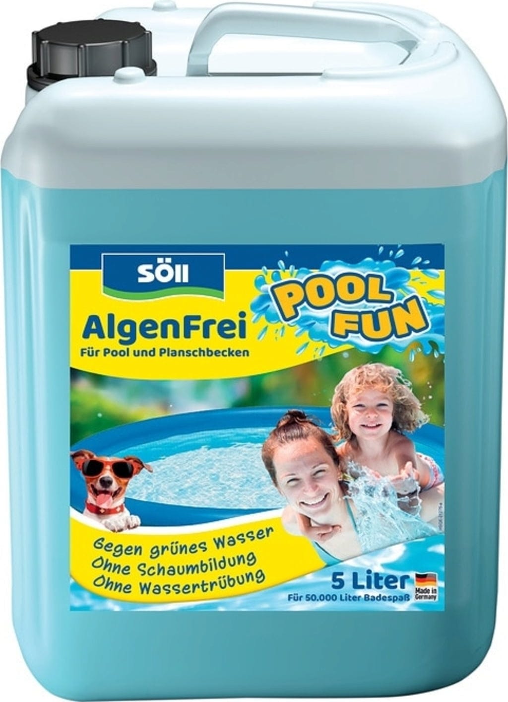 Wenn sich Algen in Planschbecken oder Kinderpool bilden und sie das Wasser grün färben, greifst du am besten gleich zu Algenfrei von Söll. Das schnell und langanhaltende wirkende Algizid hilft, ohne unangenehme Schaumbildung oder Wassertrübungen zu verursachen.
