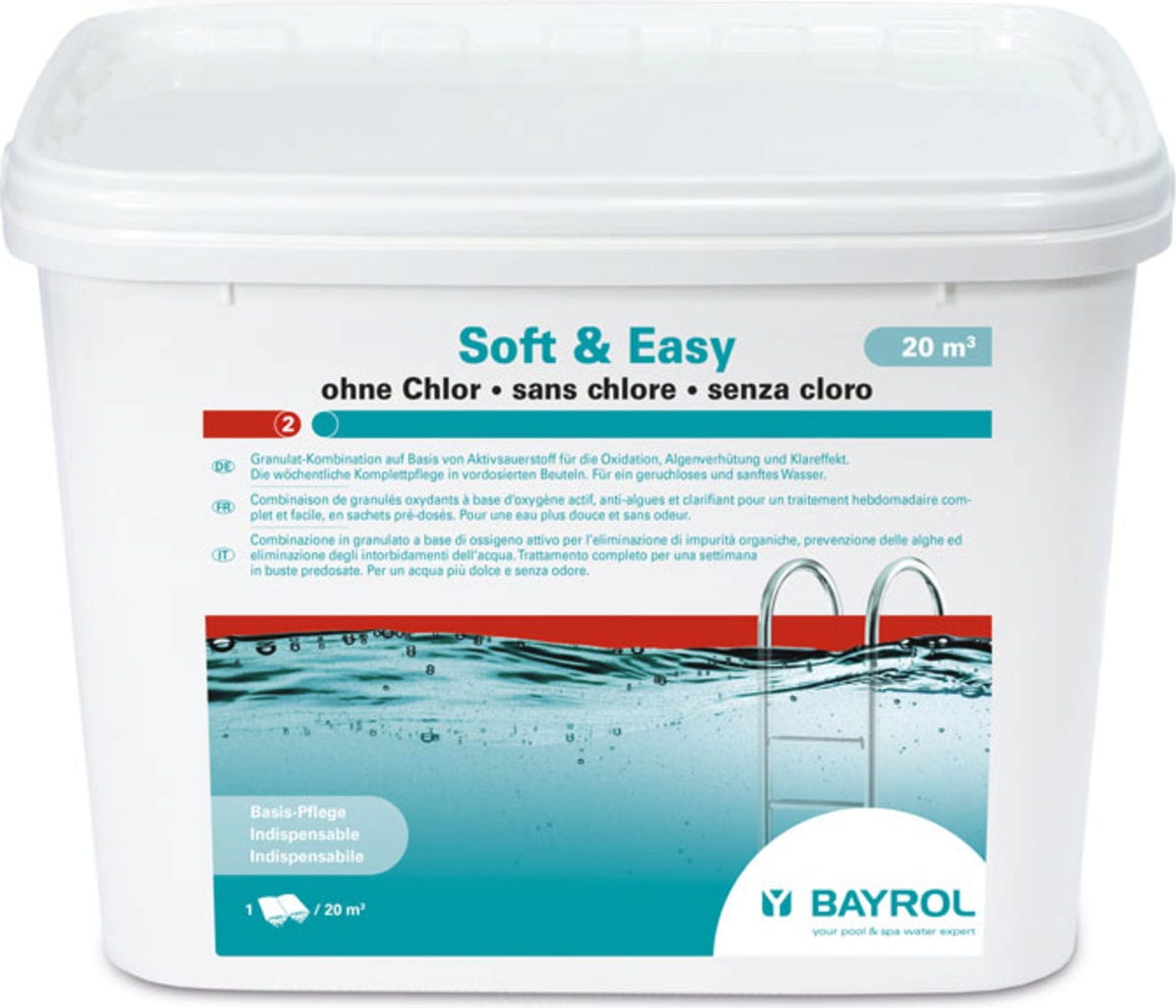 Soft & Easy est une combinaison de granulés sans chlore à base d’oxygène actif, conçue pour le traitement complet de l’eau de piscine. Elle empêche le développement des algues ainsi que la formation de dépôts calcaires et garantit une eau cristalline – en douceur et sans odeur de chlore persistante.