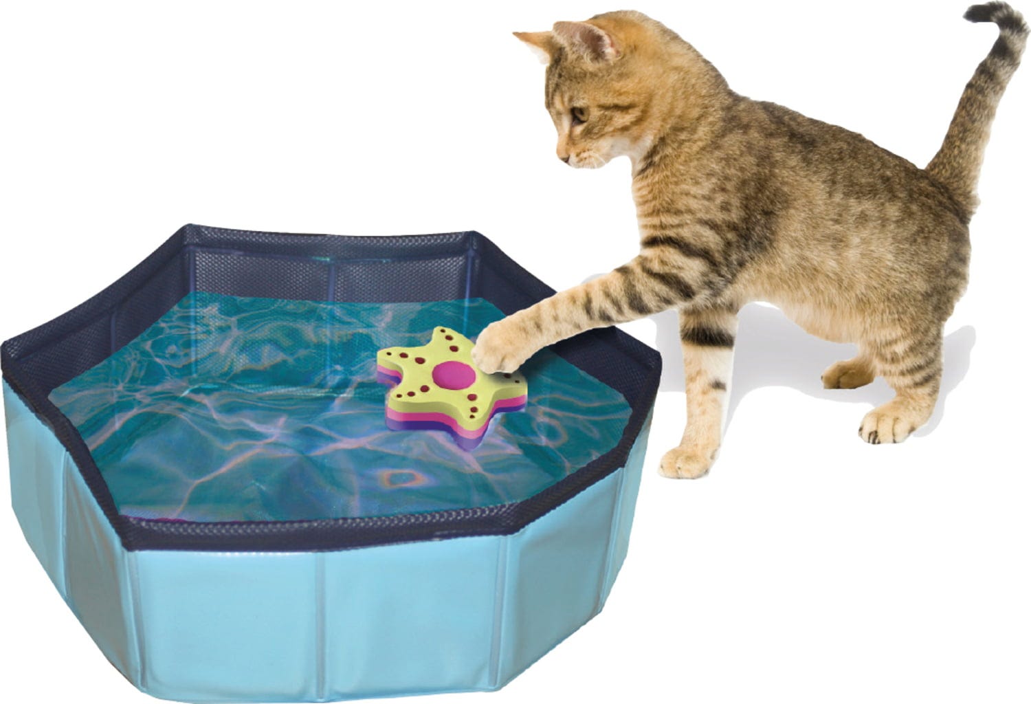 Cette piscine ludique est idéale pour tous les chats qui n’ont pas peur de l’eau. Le fond scintillant effet nacré brille sous l’eau et attire l’attention du chat, tout comme les jouets flottants qui offrent une activité supplémentaire. En déposant quelques croquettes sur les jouets, le chat prendra encore plus de plaisir à jouer.