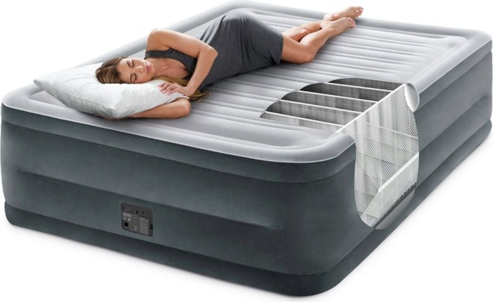 Ce matelas gonflable est doté d’une surface supérieure et de parois latérales floquées, imperméables et contrôlées pour leur qualité. Le gonflage s’effectue sans effort grâce à la pompe à air électrique intégrée. Le matelas présente une hauteur de 56 cm. Un sac de transport est inclus afin de faciliter son rangement.