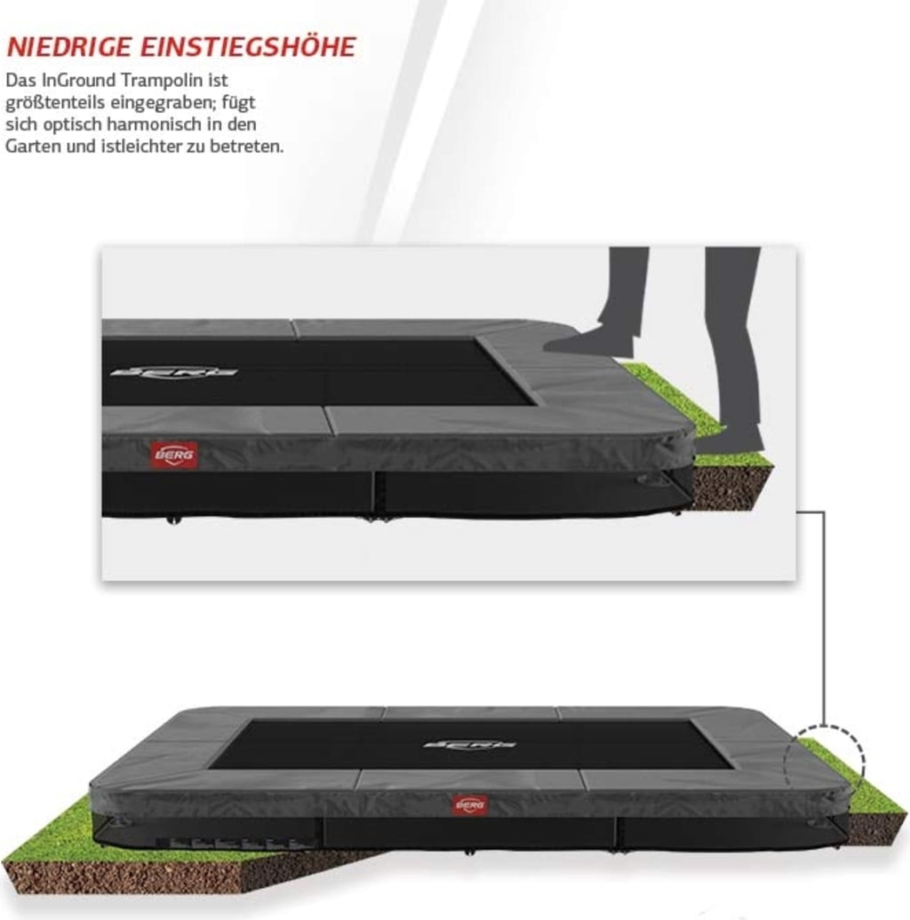 Savršen trampolin ako cijenite sjajnu zabavu skakanja uz izvrsnu udobnost te istovremeno ne želite da trampolin izgleda previše glomazan u vrtu - BERG trampolin Ultim Favorit InGround ugrađen je u tlo i vrlo je jednostavan za ulazak na s trampolinom visine 20 cm. GoldSpring Solo opruge jamče optimalnu udobnost skakanja uz dobre performanse skakanja. Široki, visokokvalitetni PVC zaštitni rub pouzdano pokriva opruge, što značajno smanjuje opasnost od ozljeda. Trampolin je vrlo stabilan i može se opteretiti maksimalnom težinom korisnika od 120 kg.