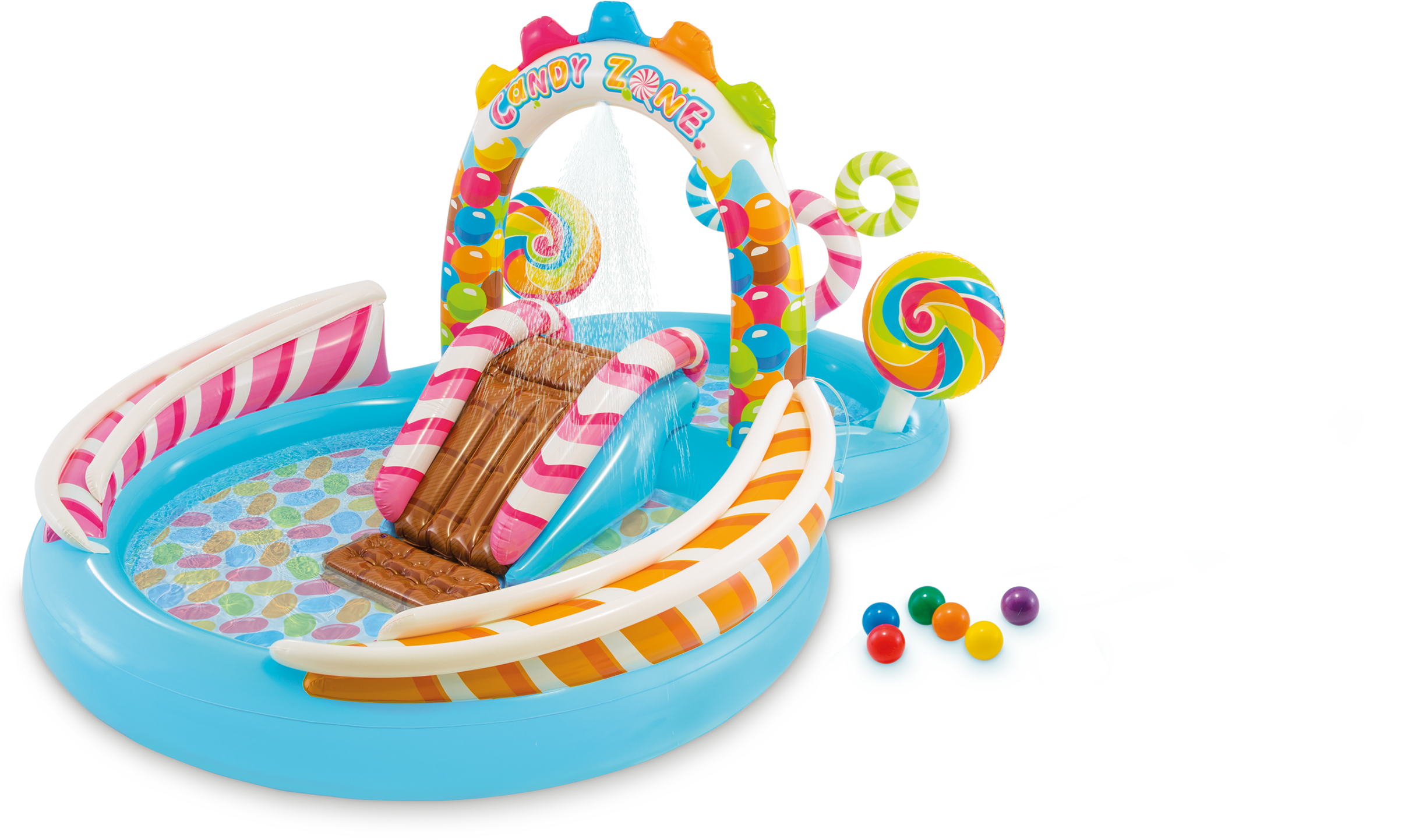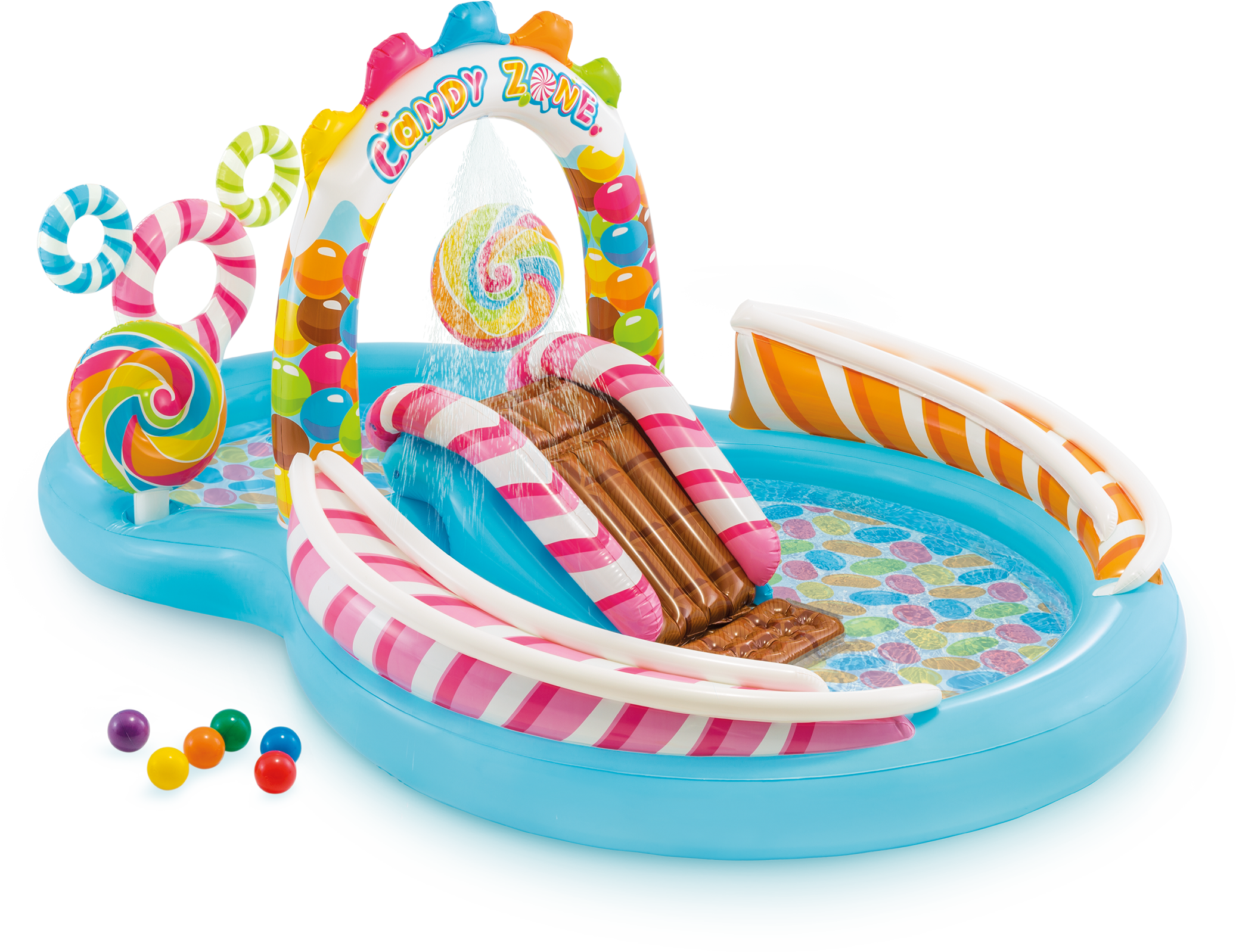 Candy Zone Play Center iz Intexa je šaren i maštovit vodeni krajolik za djecu od 2 godine na više. Na napuhavanje, mini bazen s dva bazena posjeduje tobogan i zabavnu vodenicu - jednostavno ga priključite na vrtno crijevo i zabava može početi. Za još više zabave uključeni su 2 na napuhavanje lizalice i 6 loptica za igru.