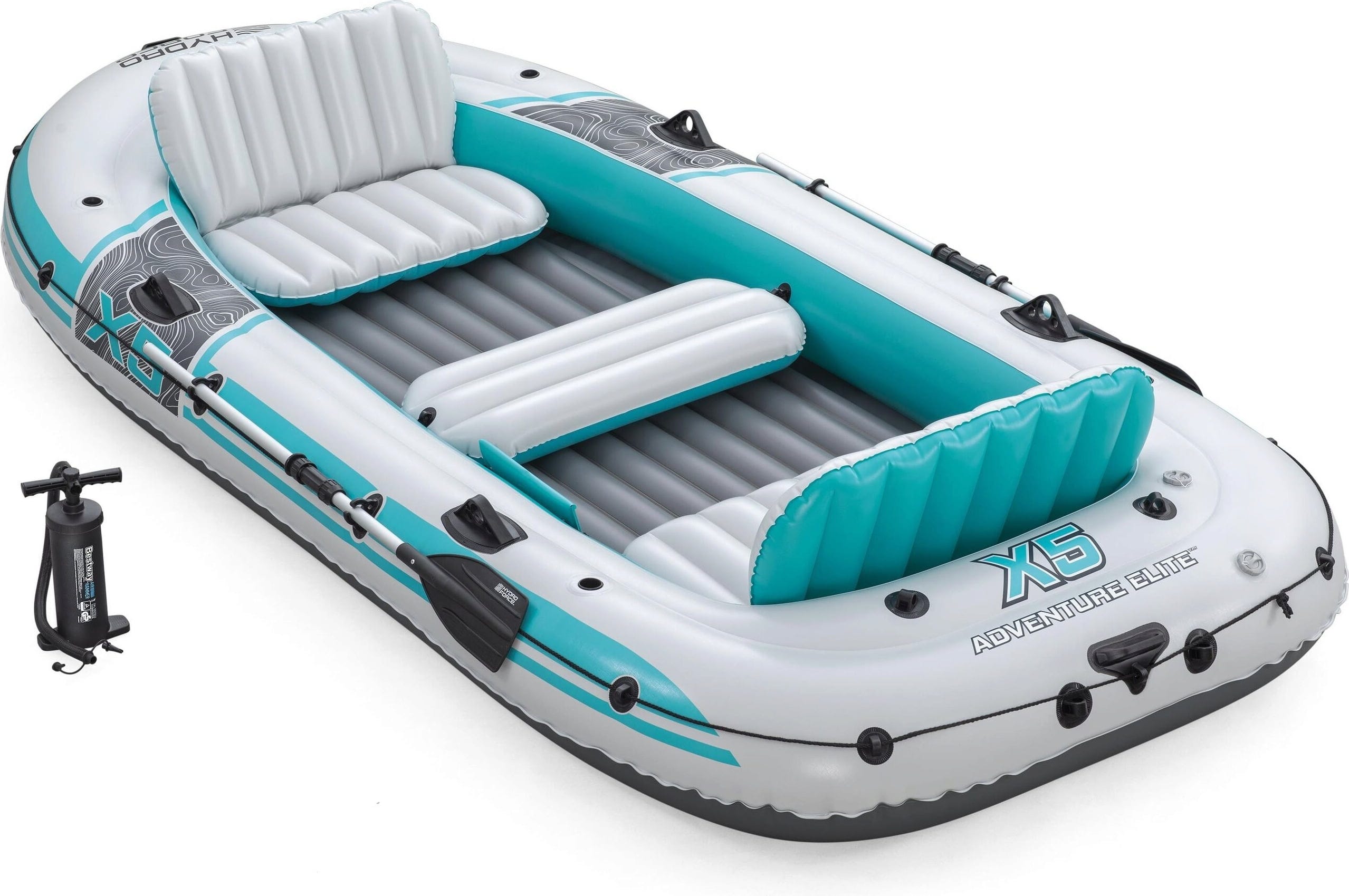 A Hydro-Force™ Adventure Elite™ X5 szettel Ön tökéletesen felszerelve vághat bele a következő vízi kalandba. Ez a tágas gumicsónak a 364 x 166 cm-es méretével elegendő helyet biztosít akár 5 felnőtt számára, és lenyűgöző, 600 kg-os teherbírással rendelkezik. Az innovatív, háromrétegű Inflata-Shield Pro™ anyagnak köszönhetően kiváló robusztusságot és maximális stabilitást élvezhet, még akkor is, ha a folyón kissé mozgalmasabbá válnak a körülmények.