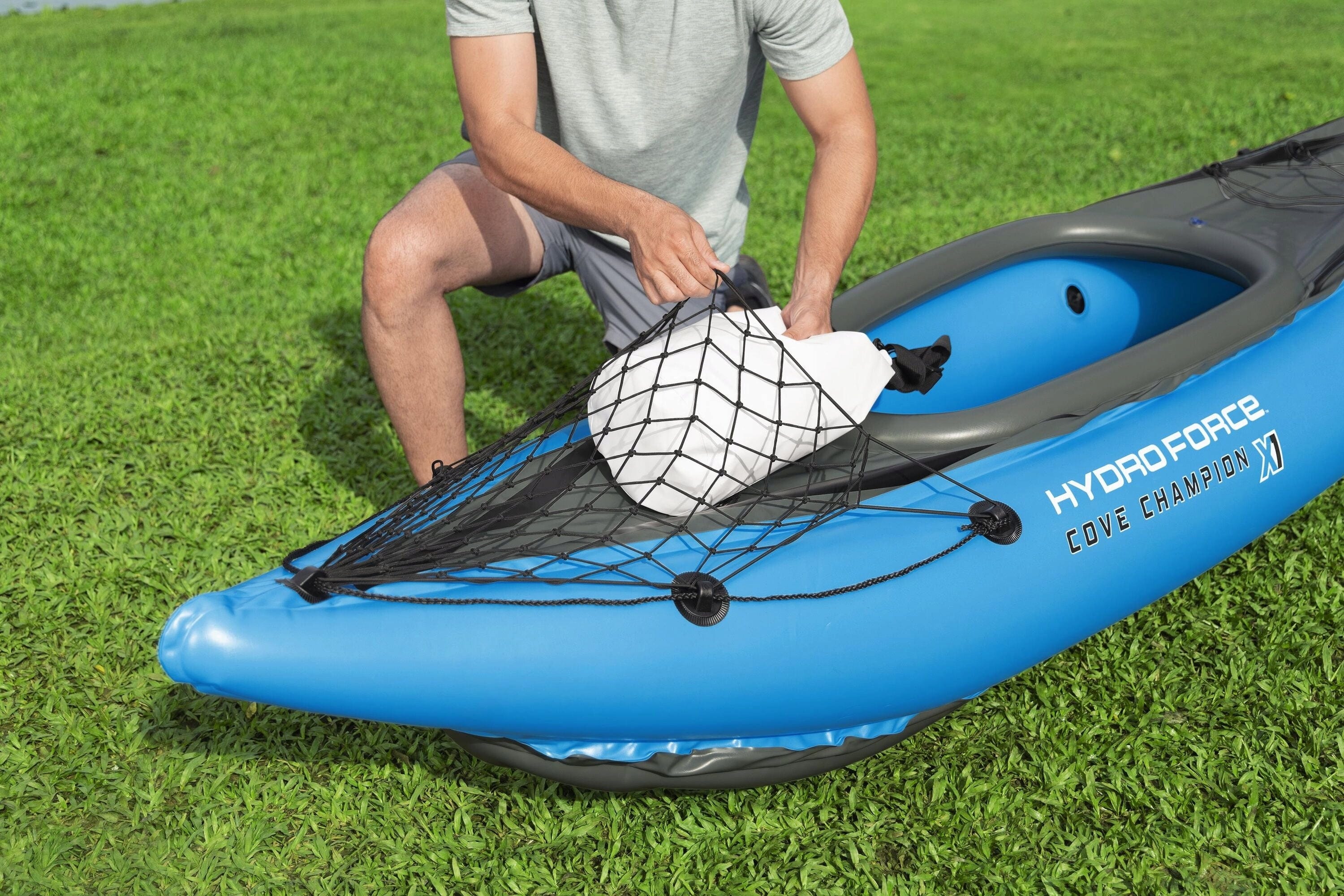 A Bestway® Cove Champion™ X1 felfújható kajakkal tökéletesen felszerelve vághat neki a túraszezonnak. A 275 cm hosszú, áramvonalas hajót kifejezetten tavakon, folyókon vagy tengeren való gyors haladásra fejlesztették ki. A rendkívül ellenálló Inflata-Shield™ anyagnak köszönhetően minden túra során nagyfokú formatartást élvezhet. A zárt Cockpit-Design gondoskodik arról, hogy ne jusson víz a belső részbe, miközben Ön kényelembe helyezheti magát az állítható háttámlával ellátott, felfújható ülésben.