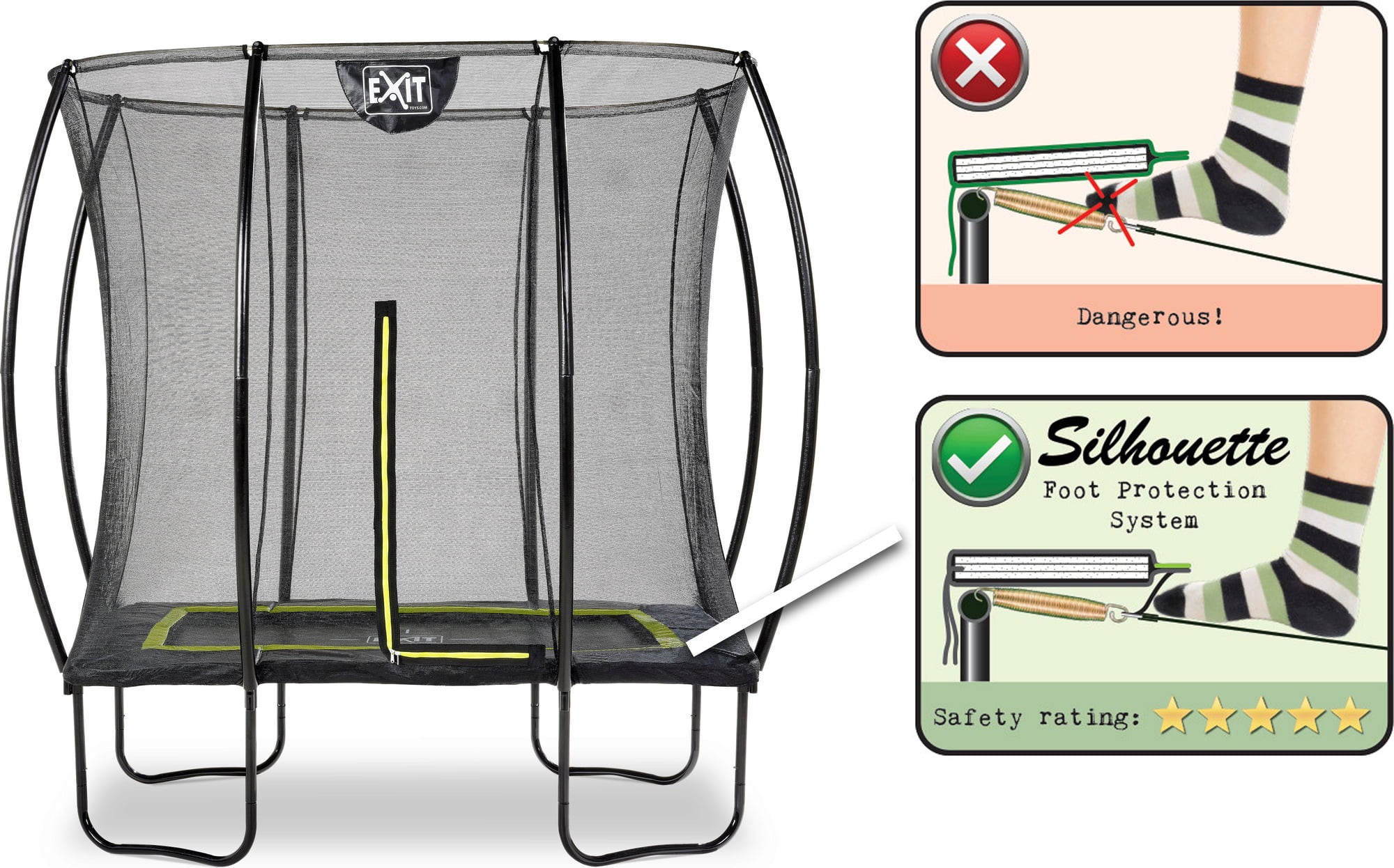 Compacte trampoline op vier metalen W-pootjes - De Silhouette trampoline van EXIT Toys met goede stuiterkracht verhoogt gegarandeerd het speelplezier voor je kinderen. Een veiligheidsnet, dat strak op acht buitenste palen is gespannen, zorgt voor absolute veiligheid tijdens het springen. De zwarte beschermrand dekt de veren perfect af en voorkomt dankzij het voetbeschermingssysteem ook dat je voeten klem komen te zitten tussen de veren. Het frame van de trampoline is bestand tegen roest en alle weersomstandigheden. Voor langdurig springplezier buitenshuis.