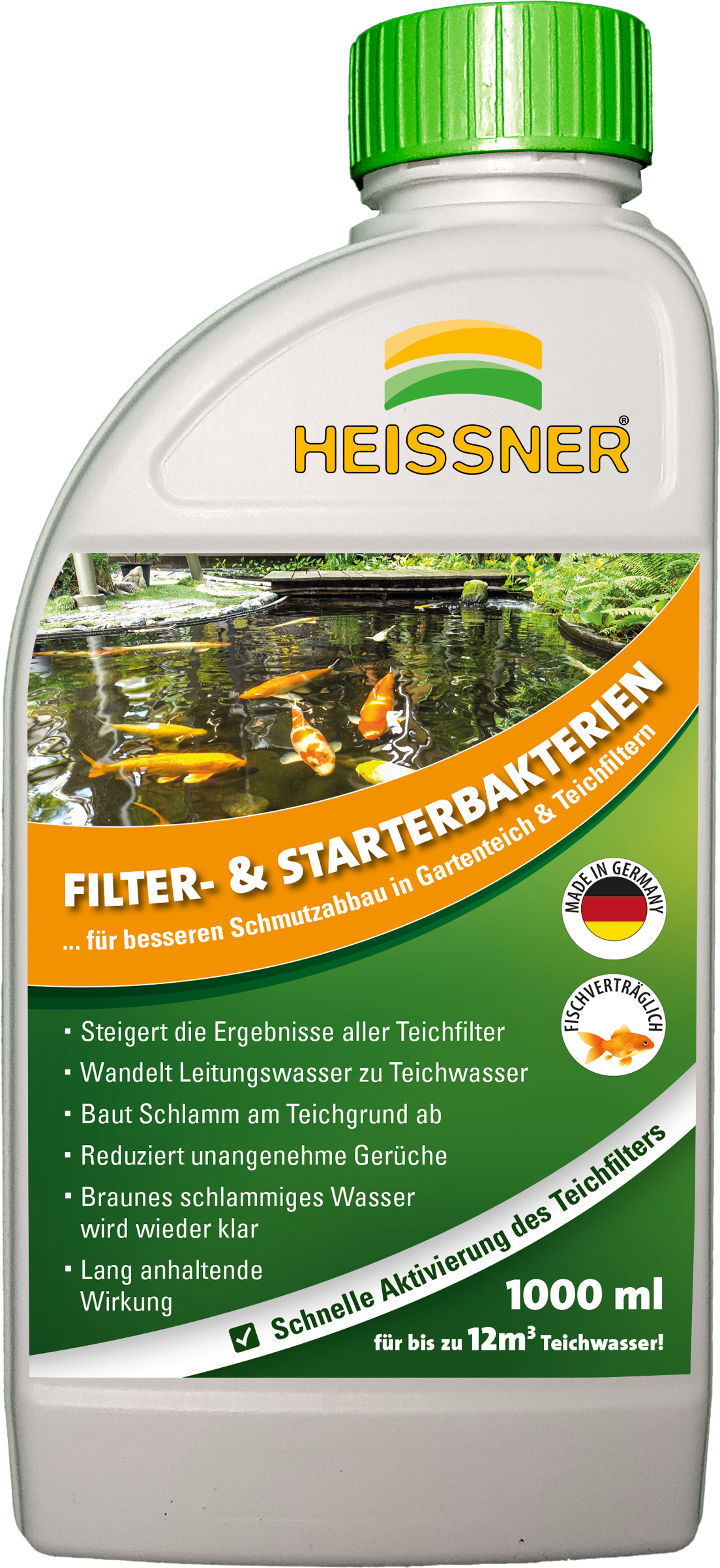 De HEISSNER Filter- & Startbacteriën verrijken het ecosysteem met essentiële micro-organismen die de natuurlijke afbraak van schadelijke stoffen in de vijver en het filtersysteem aanzienlijk versnellen. Door het gericht toevoegen van behulpzame bacteriestammen worden zelfreinigingsprocessen geactiveerd, die bruin, modderig water klaren, onaangename geuren neutraliseren en organische afzettingen op de vijverbodem effectief verminderen.