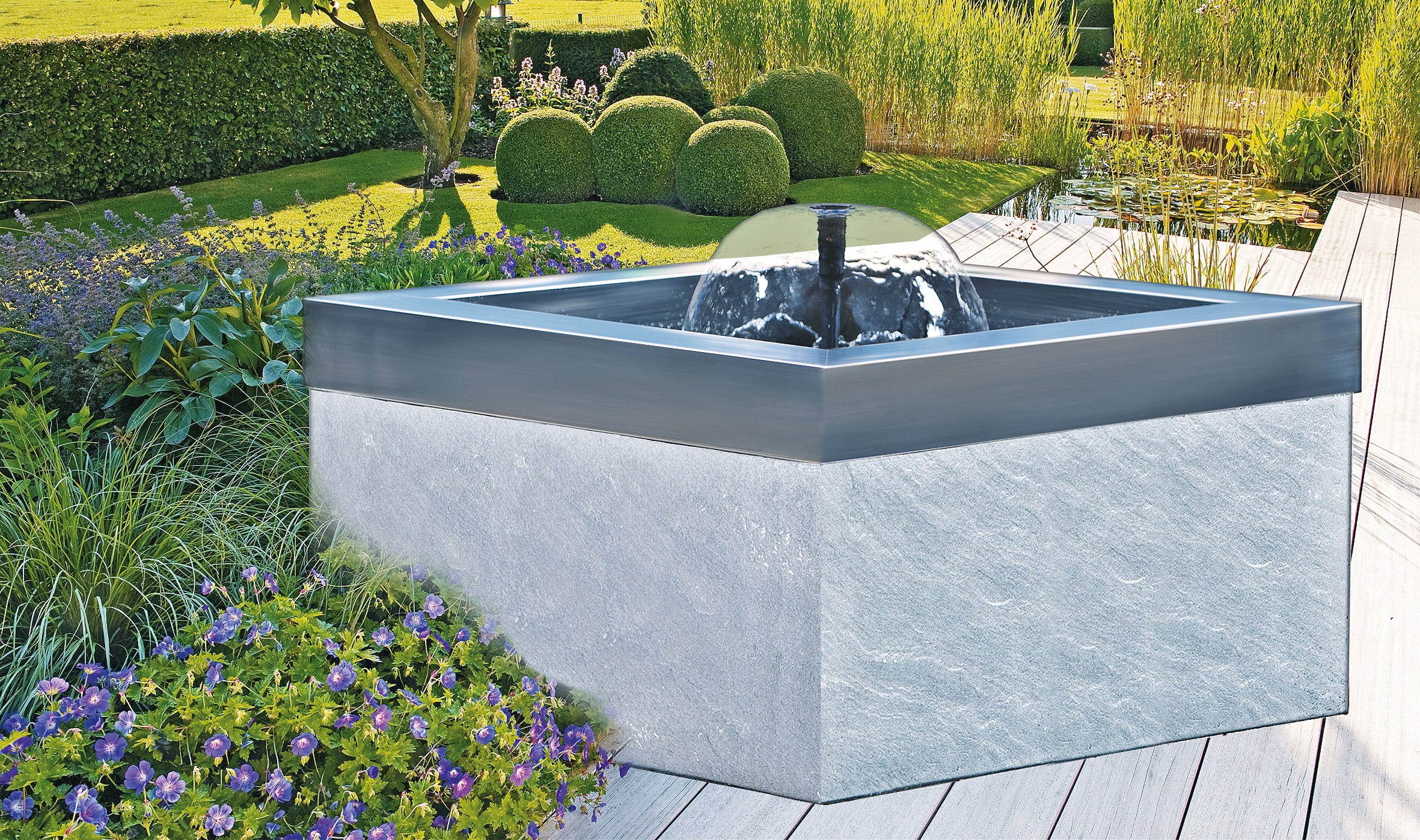 O lago pré-formado HEISSNER permite uma criação de lago simples e segura, sem os riscos associados à instalação tradicional de lona. A cuba em polietileno robusto pode ser integrada de forma harmoniosa em canteiros de jardim, estruturas de pedra natural ou terraços de madeira. As bordas de transbordo integradas permitem ainda uma expansão flexível da superfície de água através da combinação de várias cubas numa paisagem em cascata personalizada.