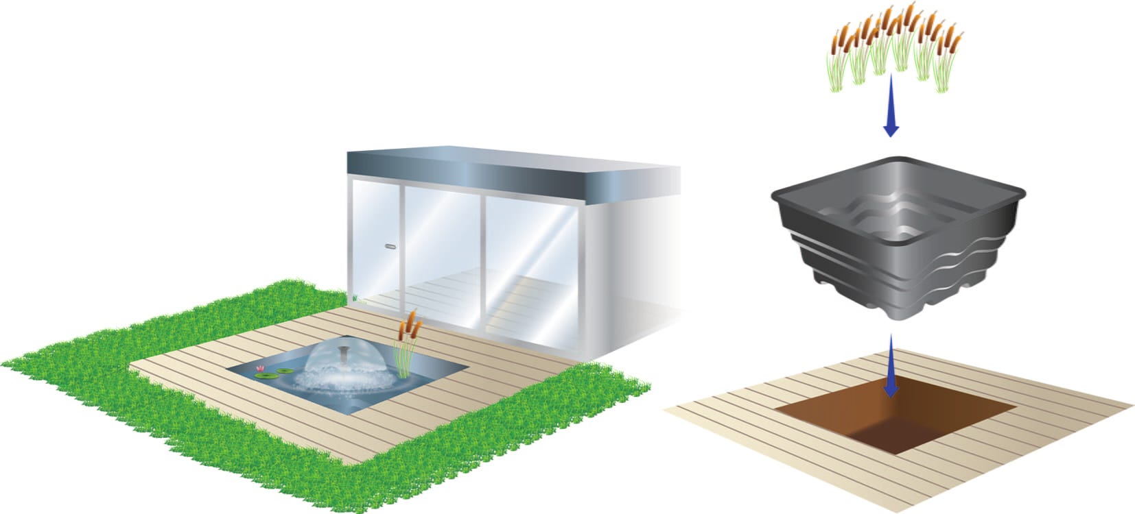 A cuba para lago pré-formado HEISSNER permite uma criação de lago simples e segura, sem os riscos associados à instalação tradicional de lona. A cuba em polietileno robusto pode ser integrada de forma harmoniosa em canteiros de jardim, estruturas de pedra natural ou terraços de madeira. As bordas de transbordo integradas permitem ainda uma expansão flexível da superfície de água através da combinação de várias cubas numa paisagem em cascata personalizada.