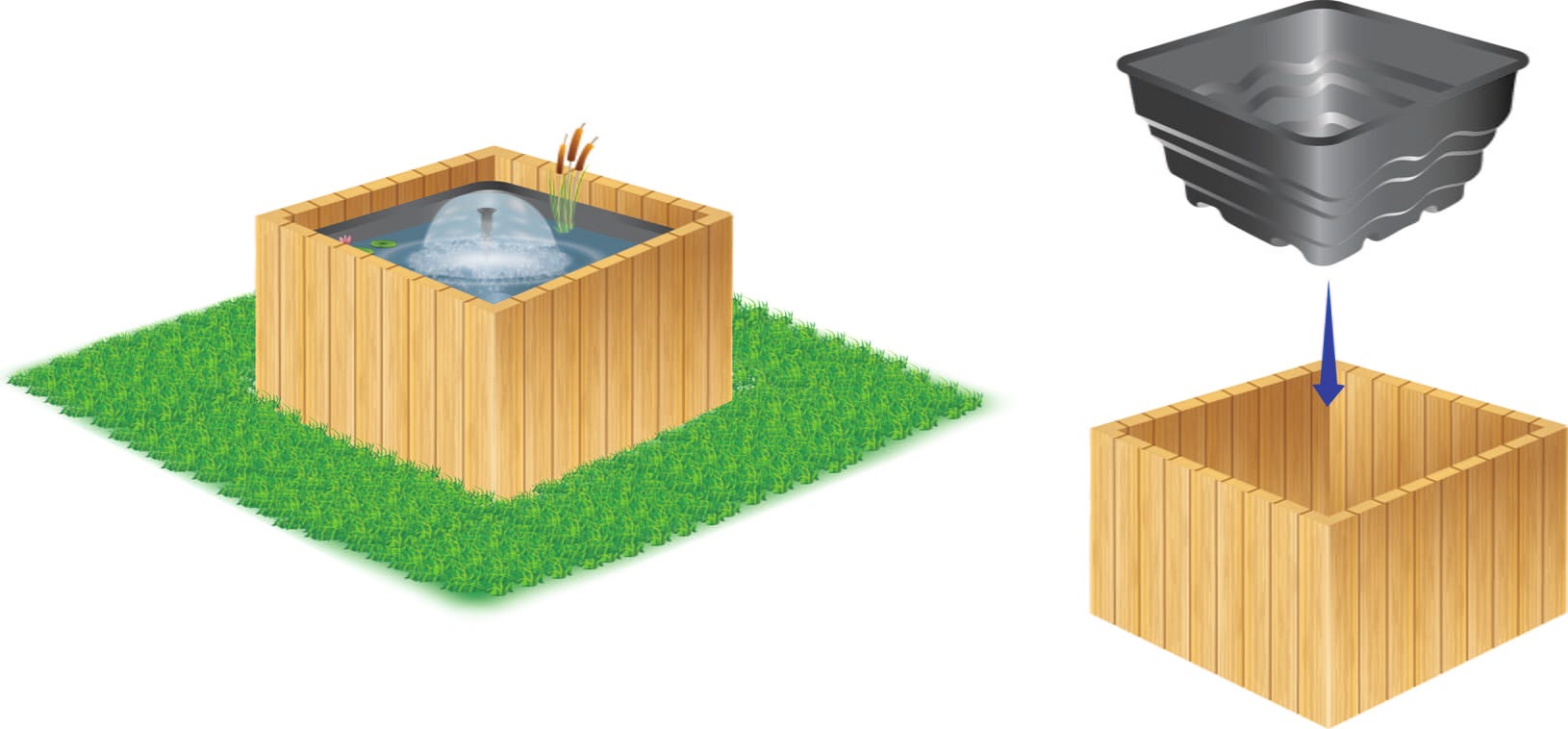 A cuba para lago pré-formado HEISSNER permite uma criação de lago simples e segura, sem os riscos associados à instalação tradicional de lona. A cuba em polietileno robusto pode ser integrada de forma harmoniosa em canteiros de jardim, estruturas de pedra natural ou terraços de madeira. As bordas de transbordo integradas permitem ainda uma expansão flexível da superfície de água através da combinação de várias cubas numa paisagem em cascata personalizada.