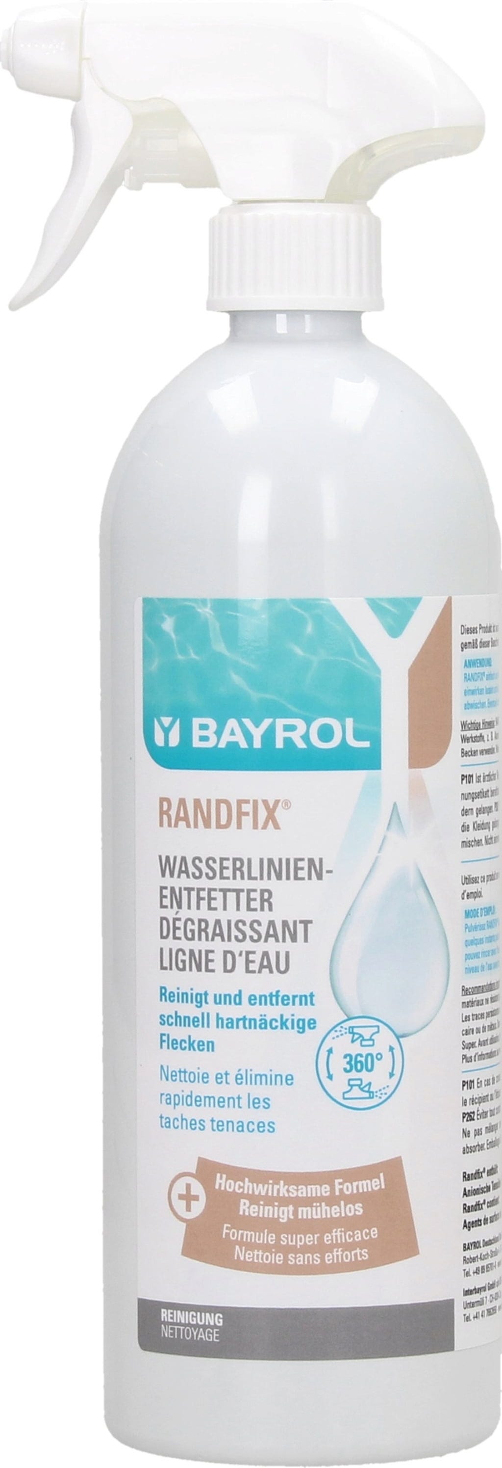 Randfix® îndepărtează depunerile inestetice de-a lungul liniei de apă și în interiorul skimmerului. De asemenea, reziduurile uleioase de la cremele solare sau machiaj pot fi îndepărtate rapid. Spray-ul simplu de utilizat poate fi aplicat în piscină în timp ce este plină.