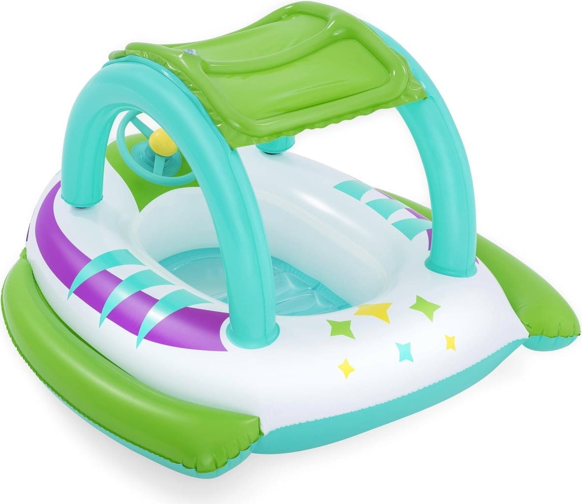 Atracția principală este acoperișul de protecție solară UV Careful™ detașabil. Astfel, ești mereu protejat de soare în timp ce te bucuri de bălăceală în apele răcoroase. Alte puncte de atracție: volanul interactiv cu un claxon încorporat și fereastra de vizualizare cool din podeaua bărcuței!
