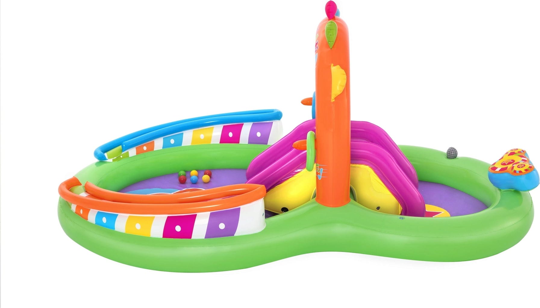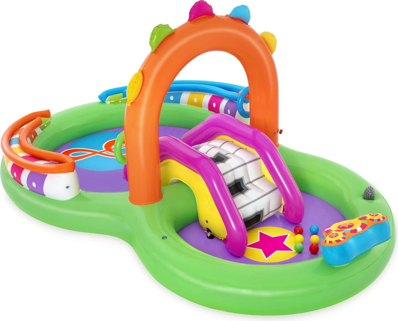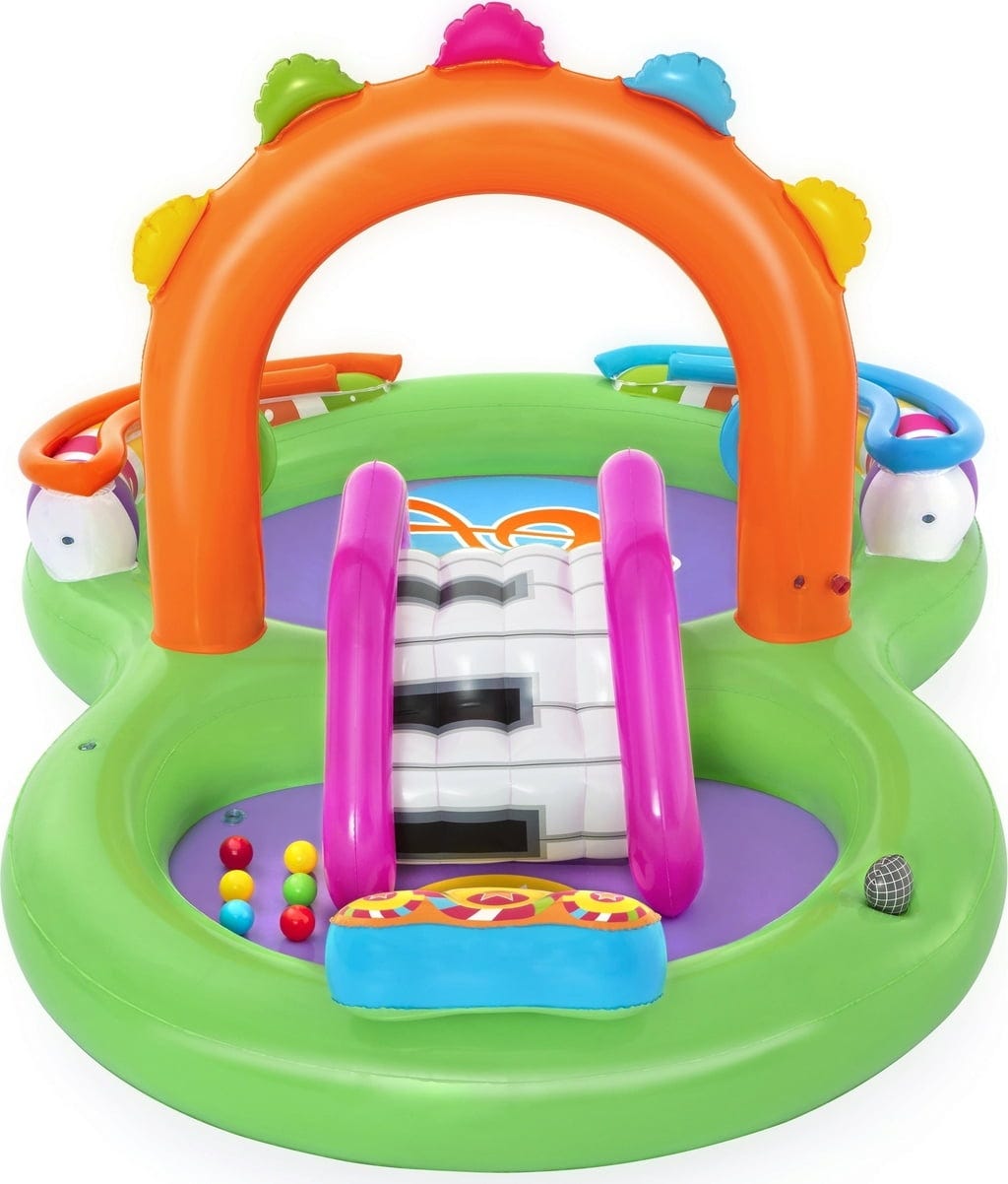 Bestway Centru de jocuri acvatice Sing 'n Splash se transformă într-o scenă pentru micii rockstar și amatorii de apă! Nu este doar un paradis de joacă, ci și locul perfect pentru răcorire! Cu instrumente muzicale gonflabile, cum ar fi microfonul și toba, copiii își pot descoperi latura muzicală și în același timp se pot juca în apă. Centru de joacă este format din două piscine, unite printr-un tobogan detașabil, iar podeaua gonflabilă de la bază asigură o aterizare moale și confort sporit.